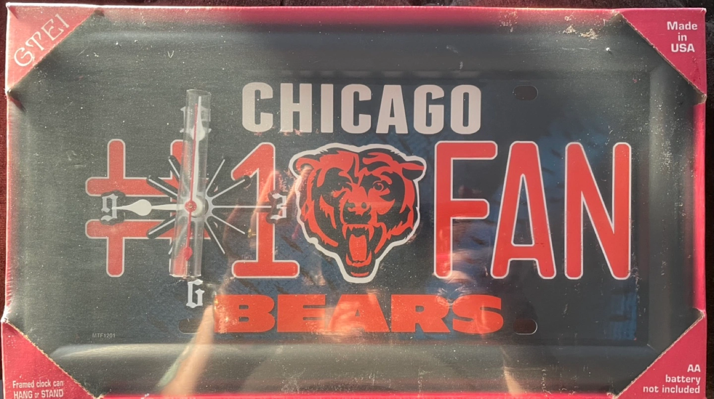 Framed clock, hangs Features Chicago Bears logo and #1 Fan. AA battery not included. Made in the USA. Quartz movement.