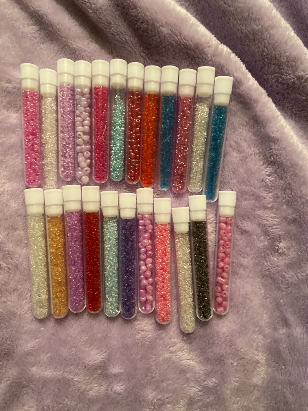 Collection of seed beads in various colours. Small, uniform beads perfect for crafting. Stored in clear tubes with white caps.