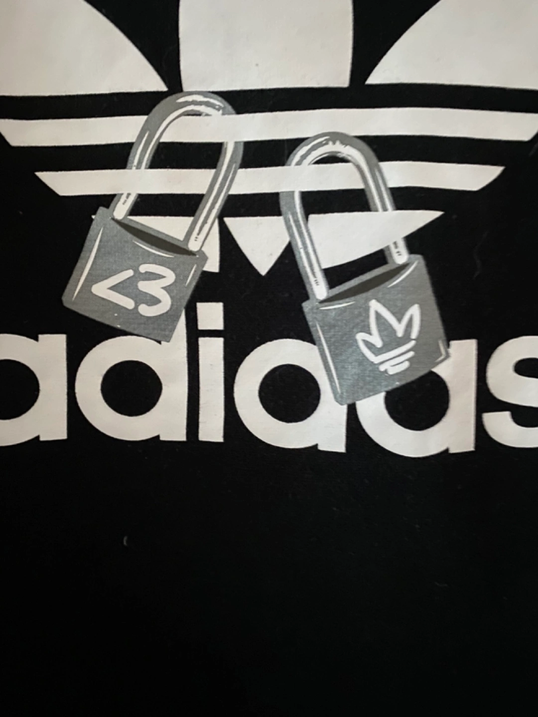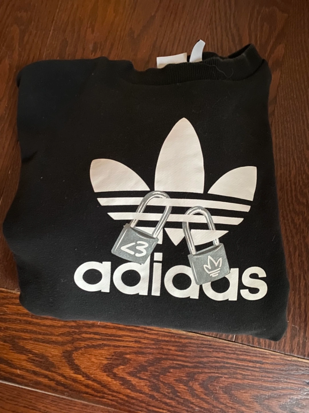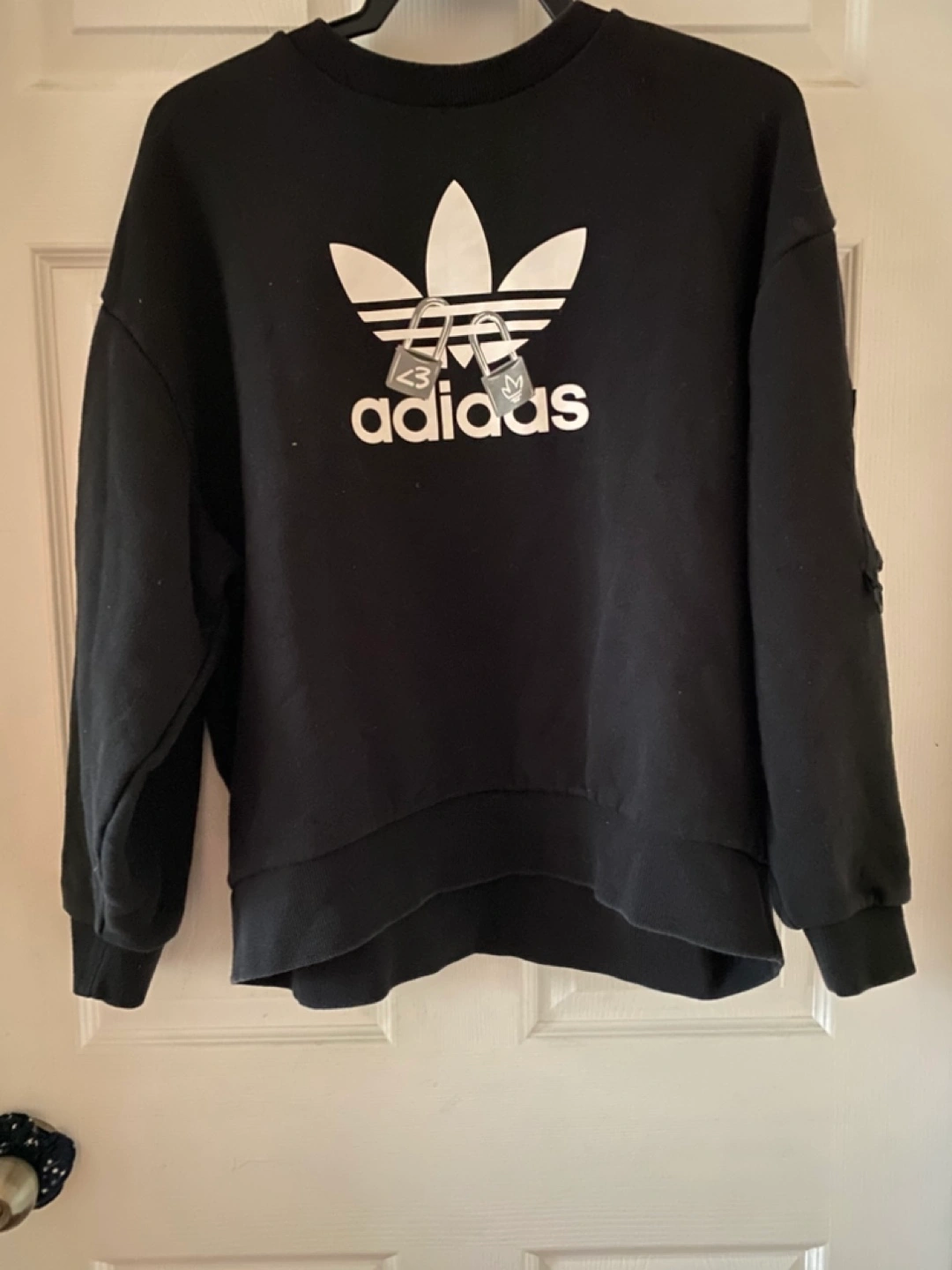 Black Adidas sweatshirt. Features a unique design with padlocks on the Adidas logo. Size medium. Excellent condition. Cash Only