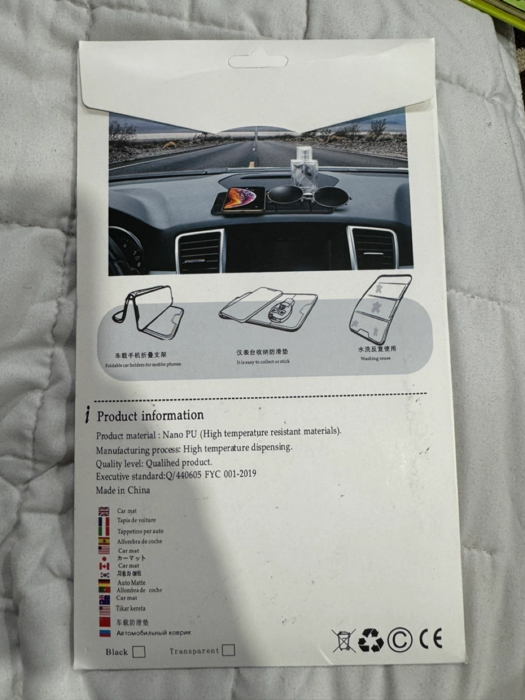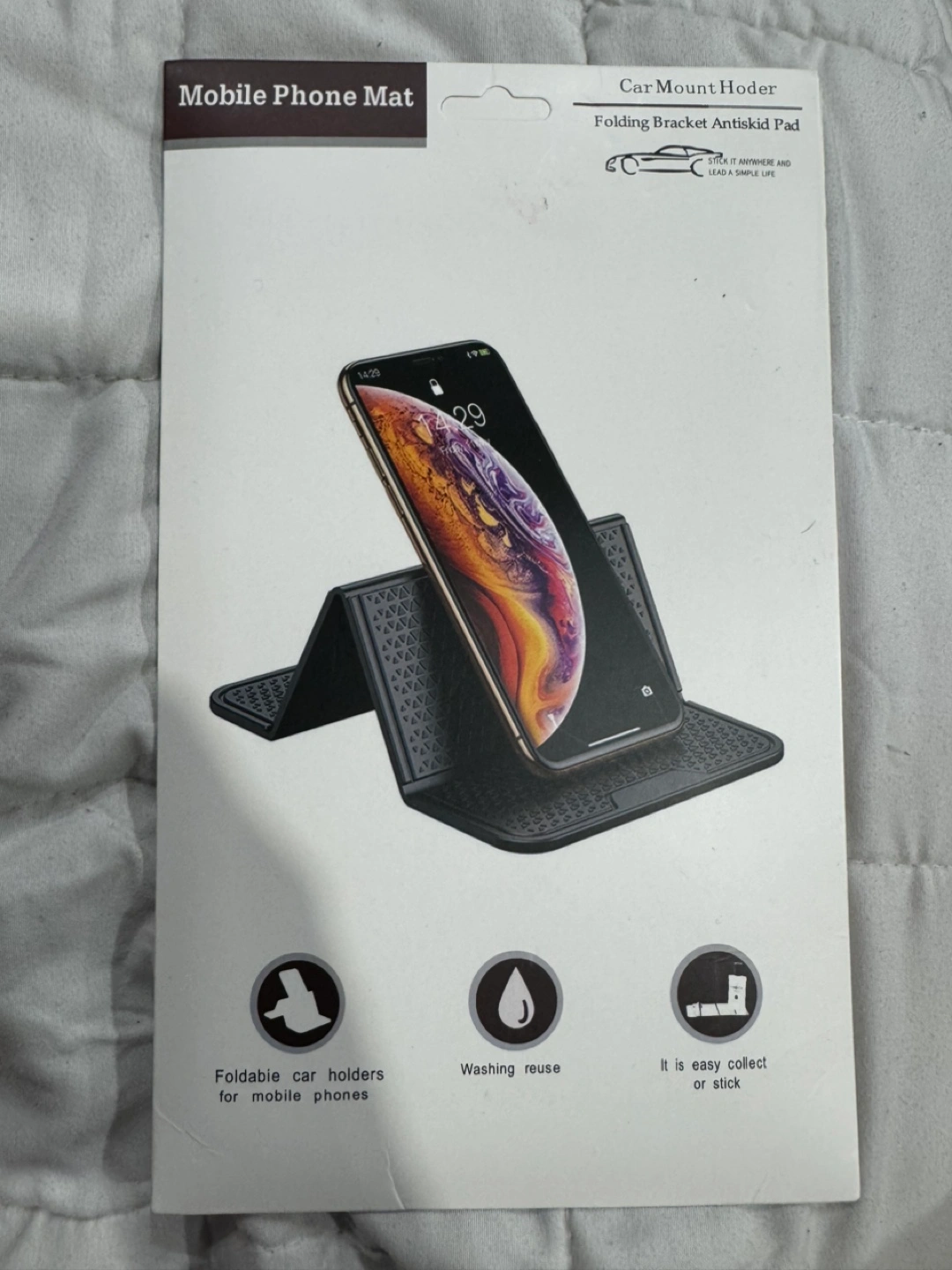 Foldable car phone holder. Nano PU material, high-temperature resistant. Easy to collect or stick. Washable and reusable. Quality product.