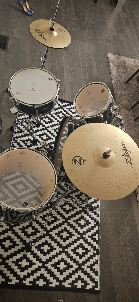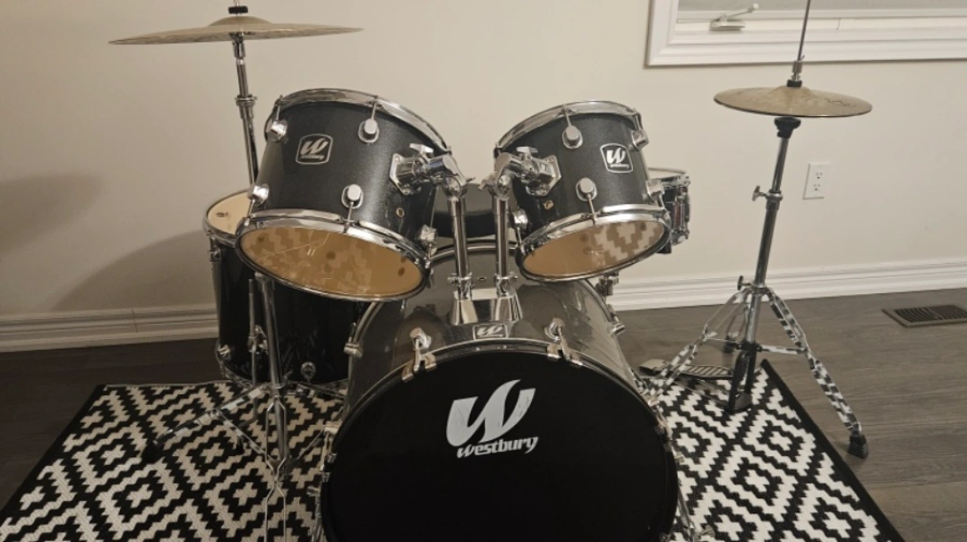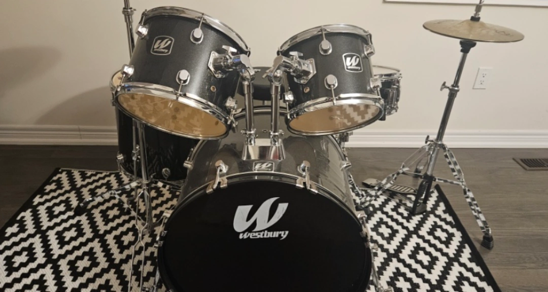 Used Westbury drum set. Includes bass drum, snare drum, toms, cymbals, and hardware. Great for beginners or practice.