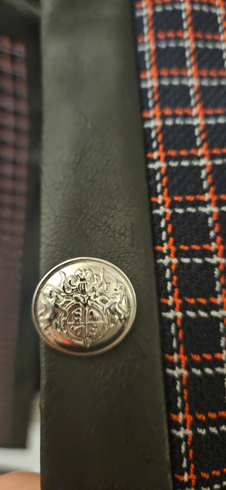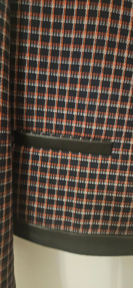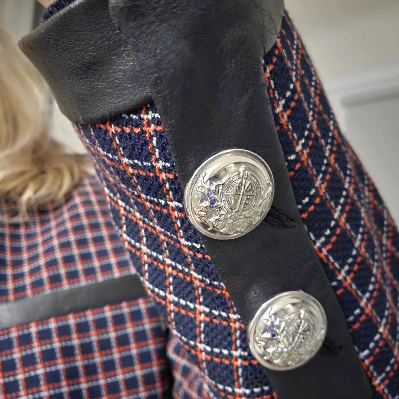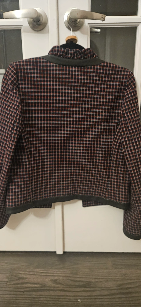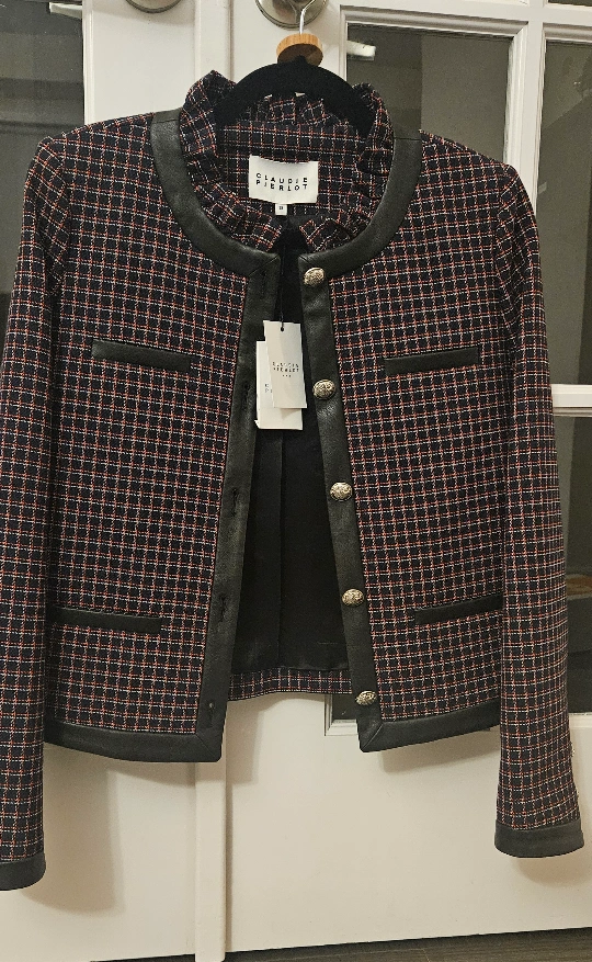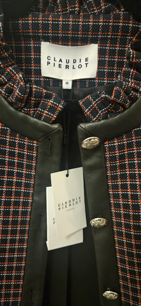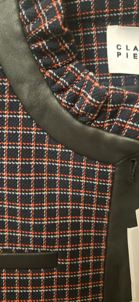 Gorgeous Claudie Pierlot tweed jacket. Size 38. Features a unique check pattern in blue, orange and white. Black leather trim. Silver-toned buttons. New!