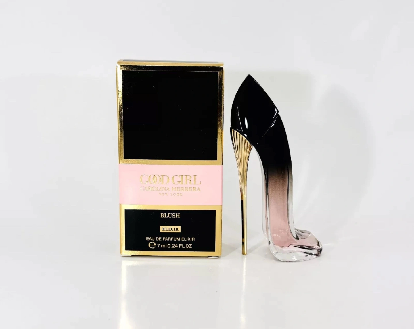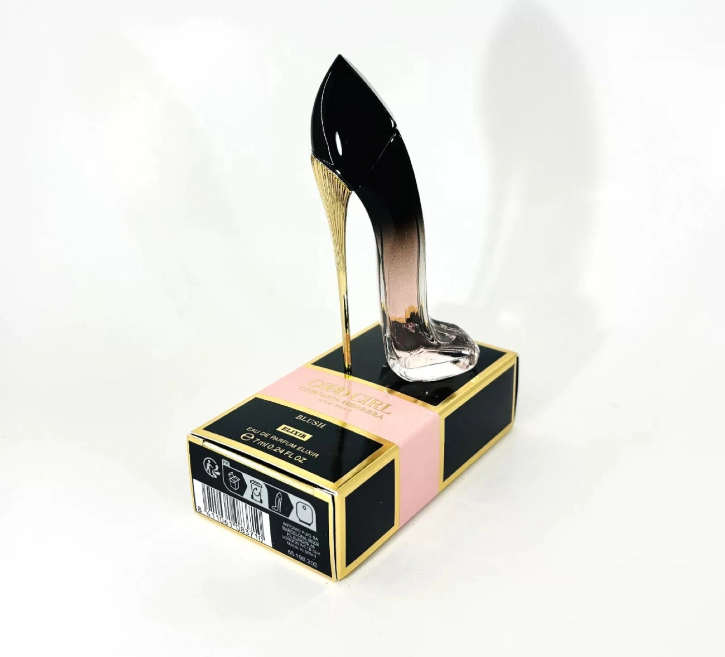 Miniature perfume. Good Girl Blush Elixir. 7ml Eau de Parfum. Stylish high-heel bottle. It smells like soft, white florals with citrusy undertones and dries down to this delicate melange of light, creamy vanilla with an ylang-ylang background.