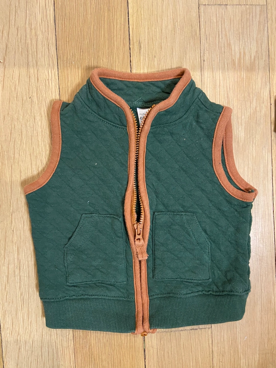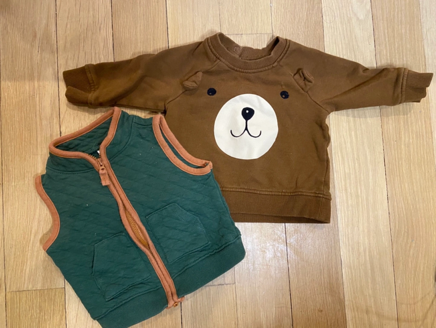 Cute two-piece outfit. Brown bear sweatshirt, green quilted vest. 4 month - 6 months