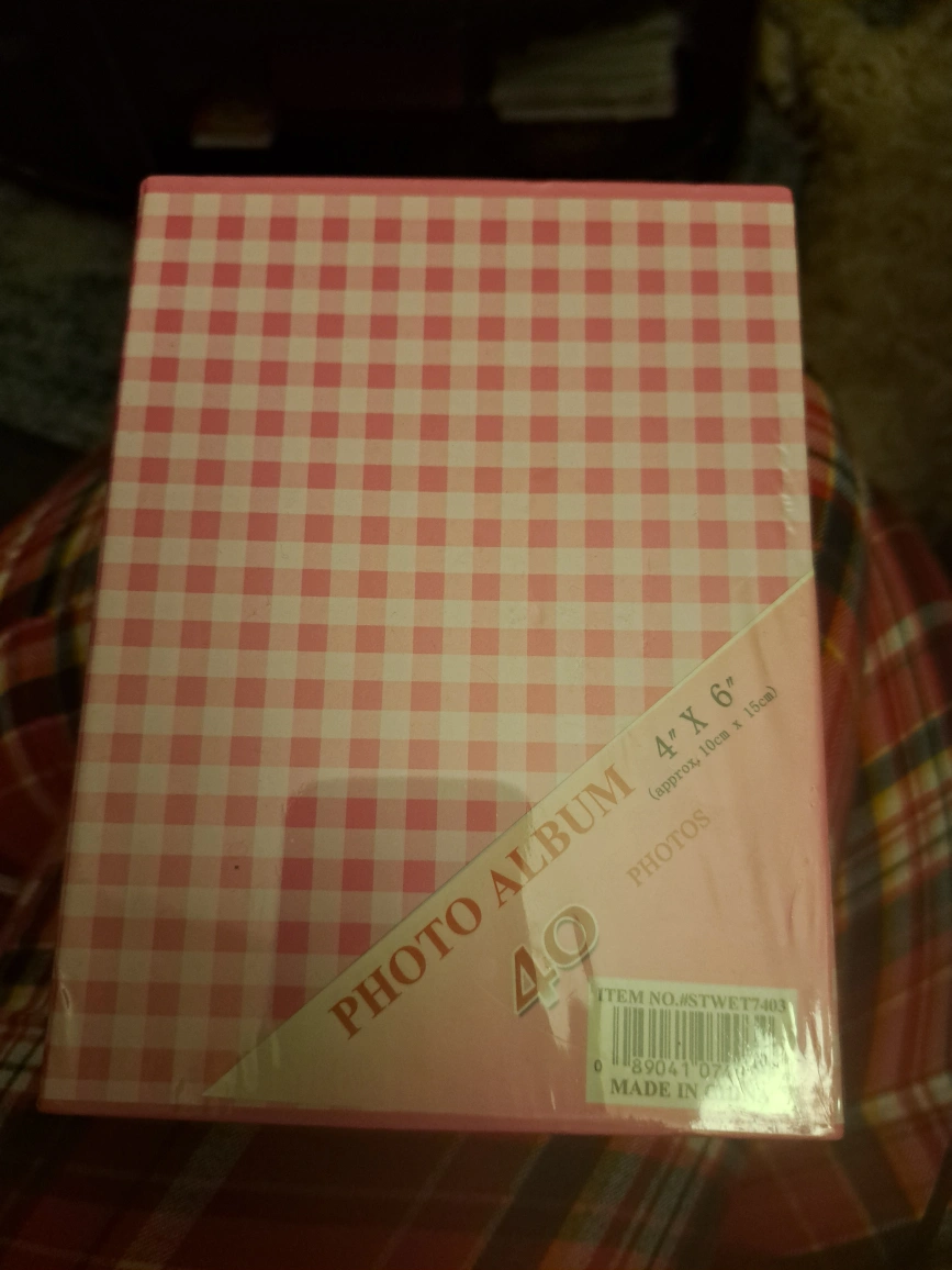 New photo album. Pink gingham cover. Holds 40 photos, 4x6 inch size.