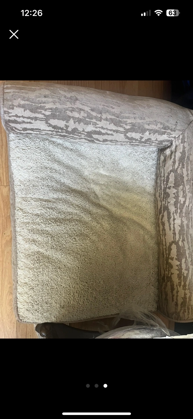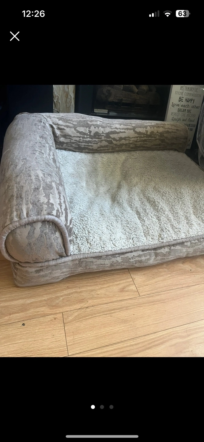 Soft, plush pet bed. Features a beige, fluffy interior and a grey patterned exterior. Great for small to medium-sized dogs or cats. Gently used. Good condition dog bed originally bought from Costco...cover can come off to be washed Paid over $200 new 31 1/2 x 25 1/2 x 6"