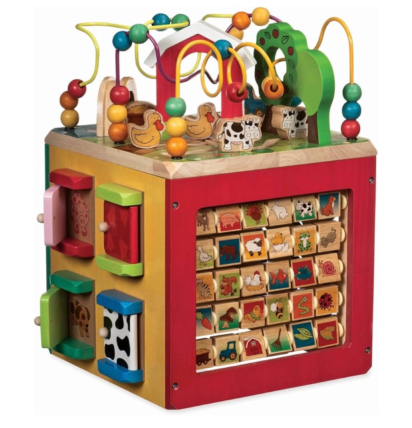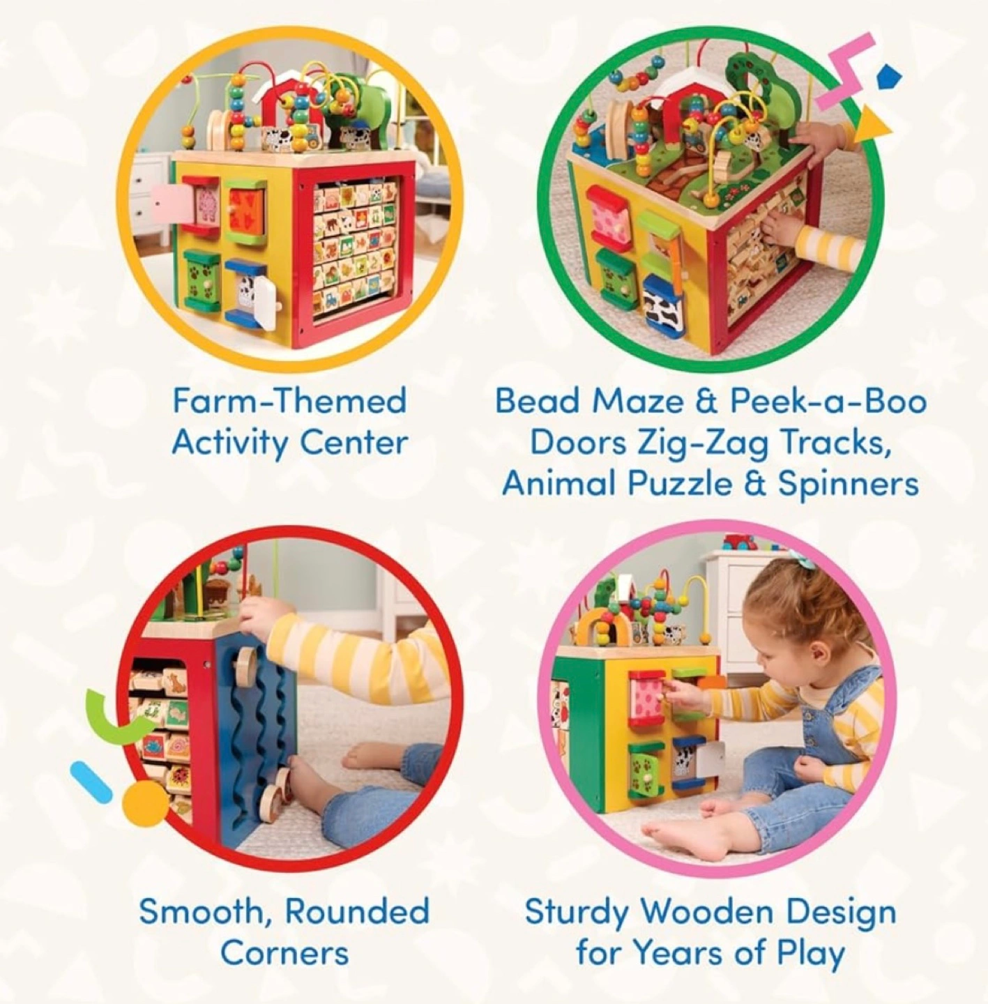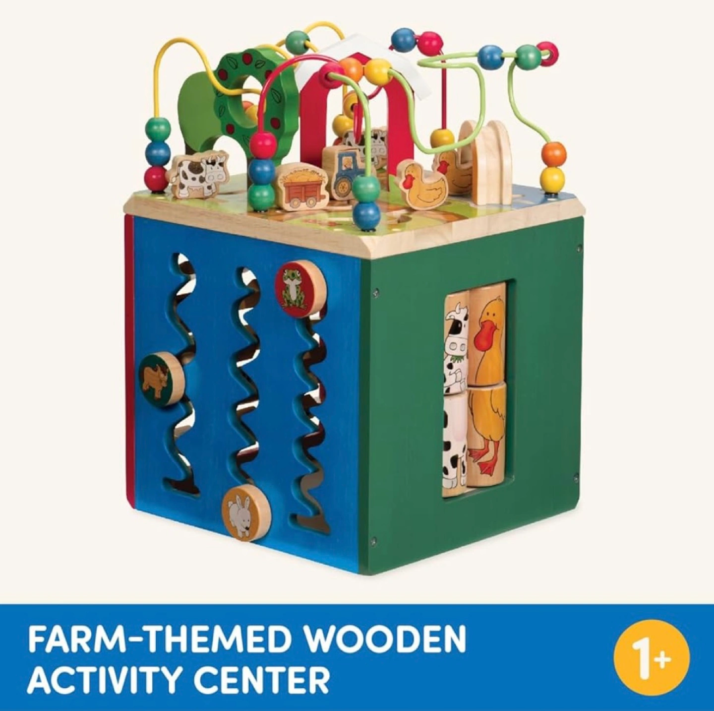 Excellent condition. Activity Center: A 5-sided wooden activity center with an adorable farm theme. 5 Sides: Includes spinners, a zigzag racetrack, a bead maze, doors to open, and mix-and-match animal puzzles. Developmental Benefits: Improve hand-eye coordination and learn cause-and-effect! Award-Winner: This activity cube is well-loved among kiddos and parents it's a multi-award-winning toy! Solid Wood: A beautifully crafted activity center with a sturdy wooden construction, bright colors, and lovely farm animal illustrations. Age Recommendation: This wooden activity center is recommended for kids 1 year +.