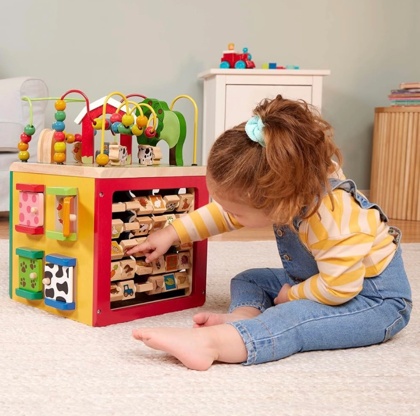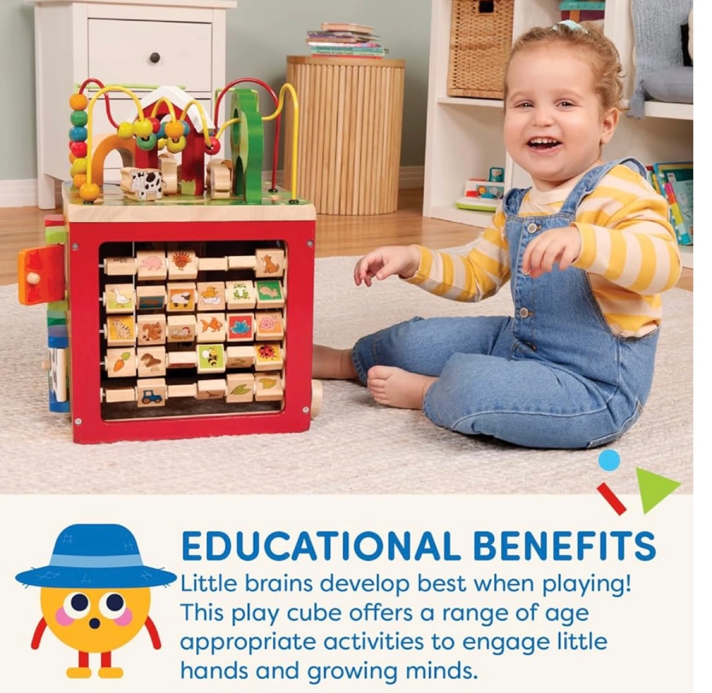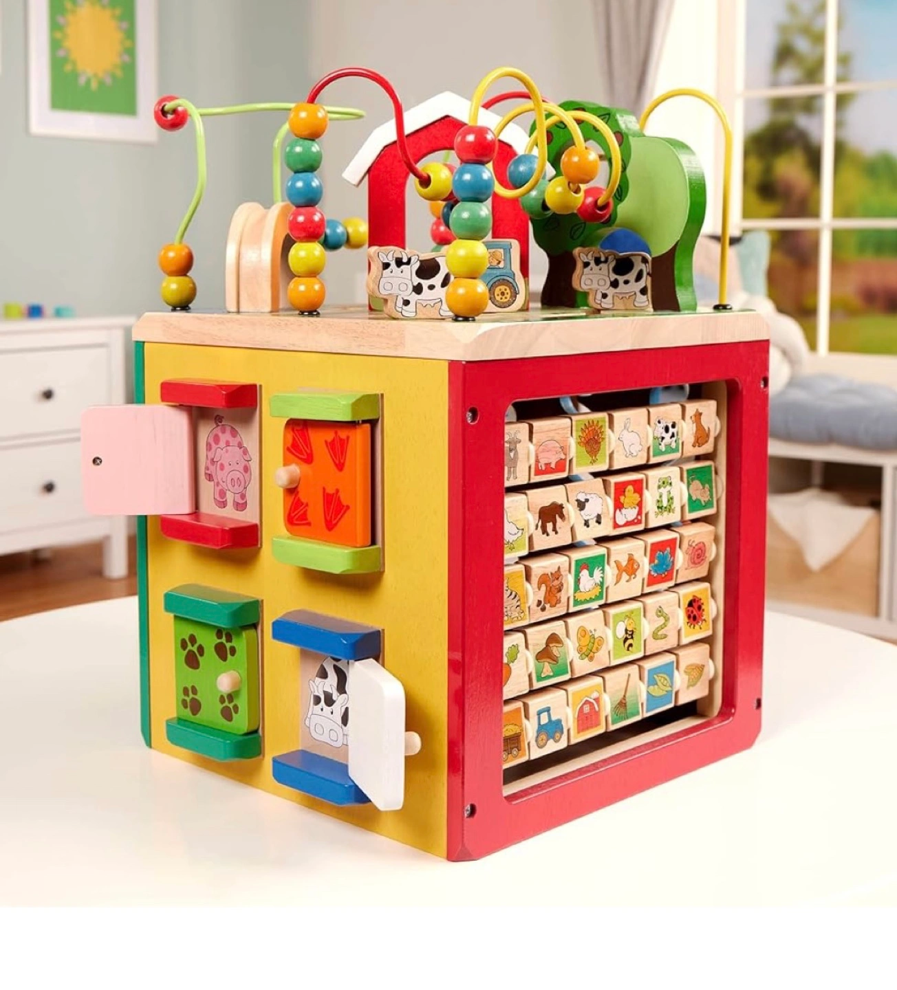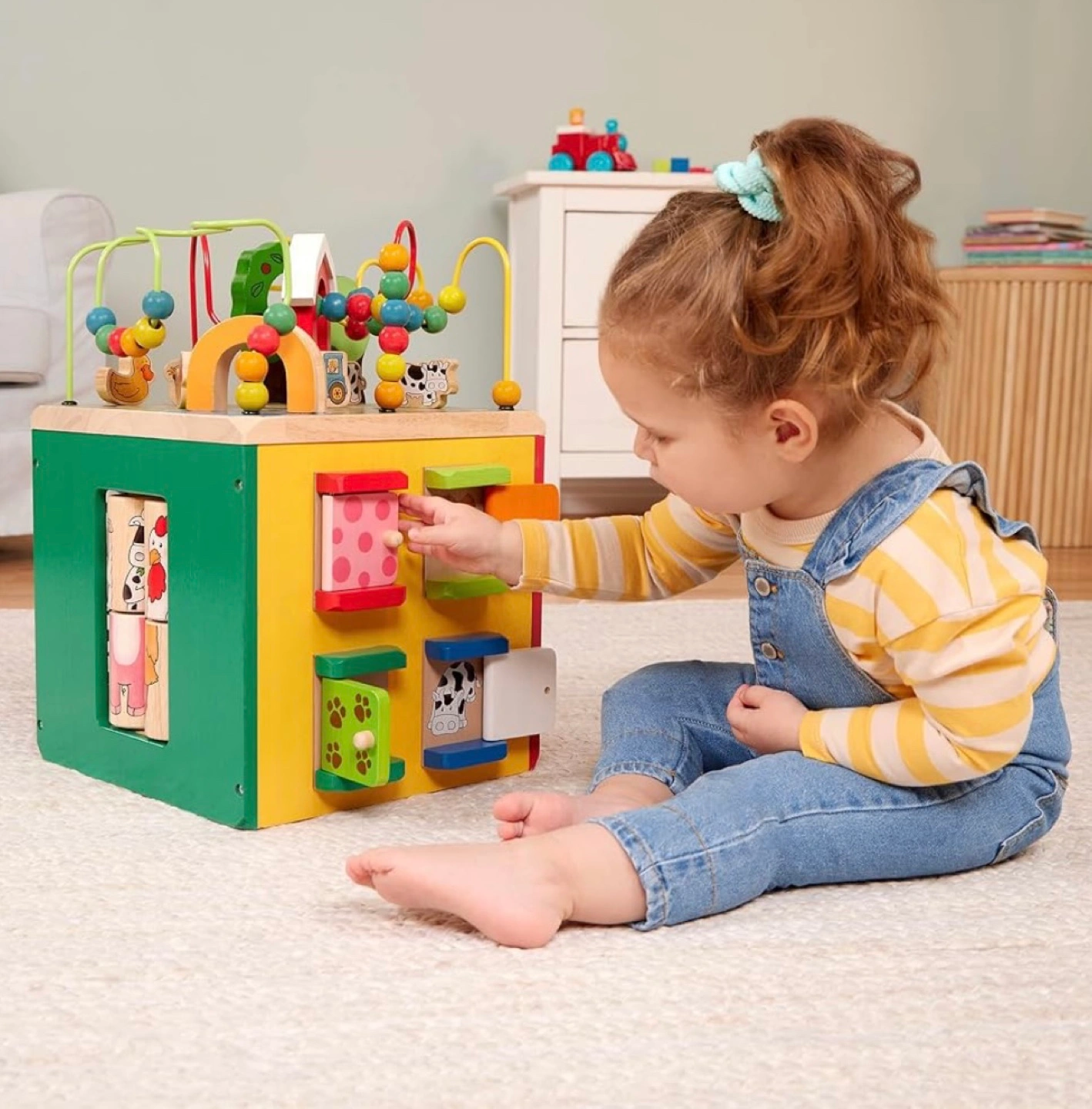 Excellent condition. Activity Center: A 5-sided wooden activity center with an adorable farm theme. 5 Sides: Includes spinners, a zigzag racetrack, a bead maze, doors to open, and mix-and-match animal puzzles. Developmental Benefits: Improve hand-eye coordination and learn cause-and-effect! Award-Winner: This activity cube is well-loved among kiddos and parents it's a multi-award-winning toy! Solid Wood: A beautifully crafted activity center with a sturdy wooden construction, bright colors, and lovely farm animal illustrations. Age Recommendation: This wooden activity center is recommended for kids 1 year +.