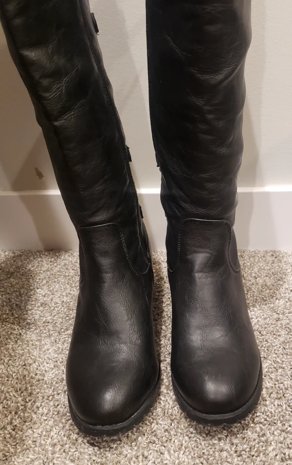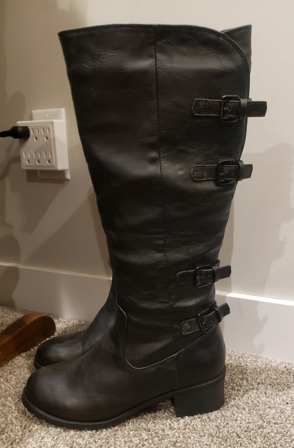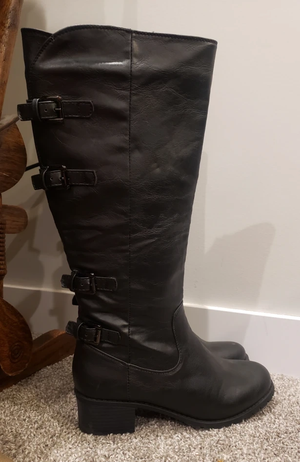 Women's black faux leather boots. Features multiple buckles. Low block heel. worn once and look brand new.