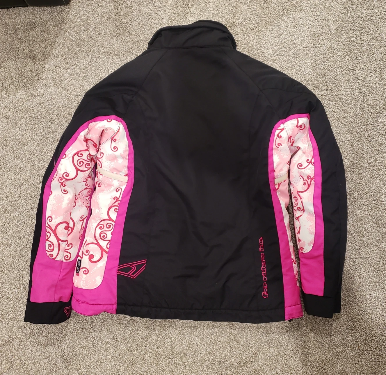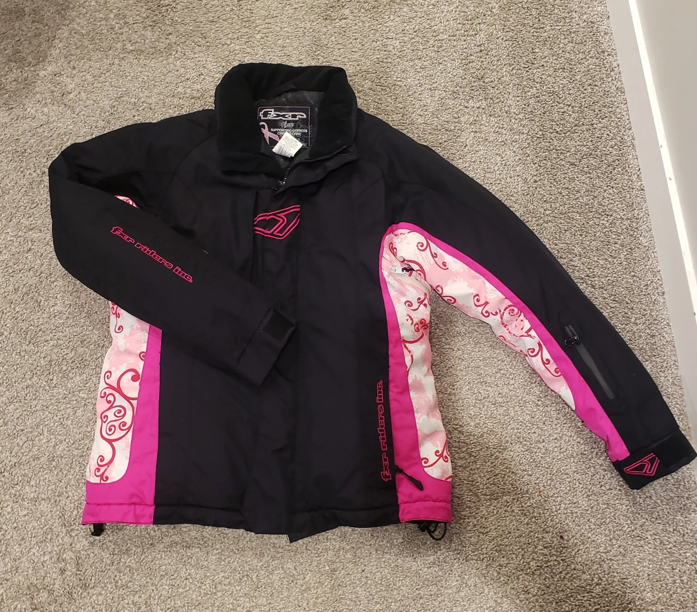 Black and pink ski jacket. Size large. Features a floral design on the sleeves and sides. Waterproof and windproof. Great for snowboarding or skiing.