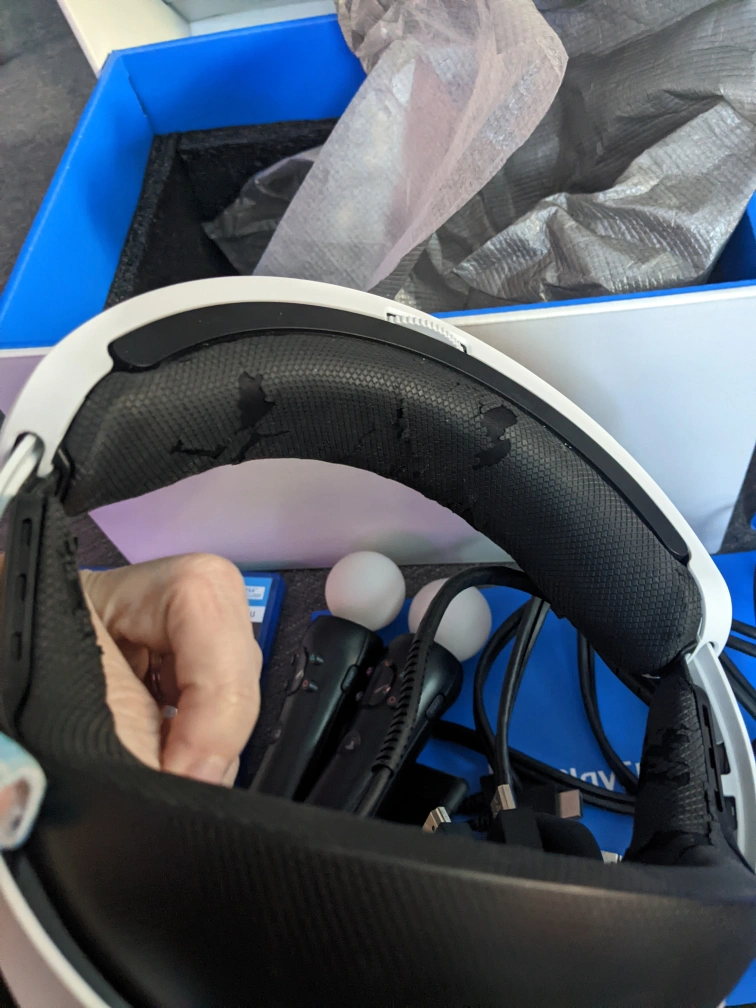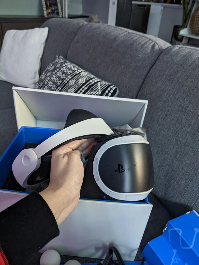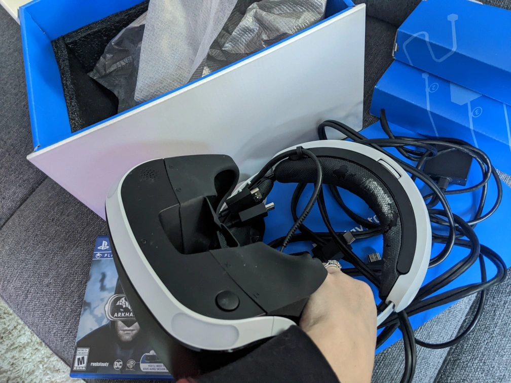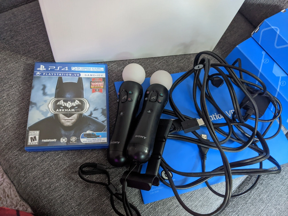 Used PlayStation 4 VR bundle with headset, camera, Batman Arkham game, and 2 move controllers, with all the cords. the inner part of headset is flaking a bit but could be fixed with some duct tape. it's still functional. pickup downtown near OCAD on McCaul st tags virtual reality PlayStation PS4 video games batman play kids home men unisex activity indoor winter GameStop Amazon