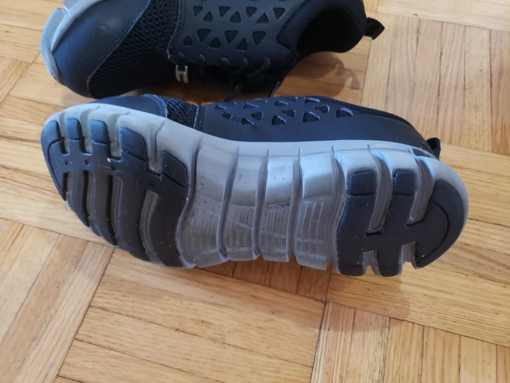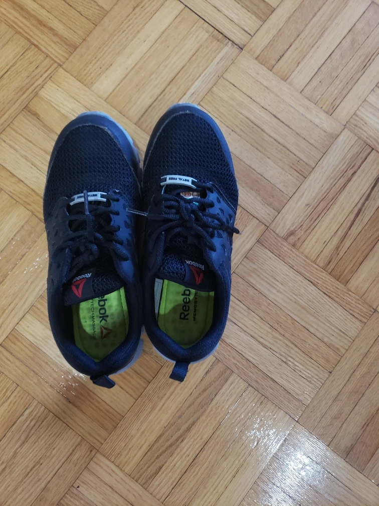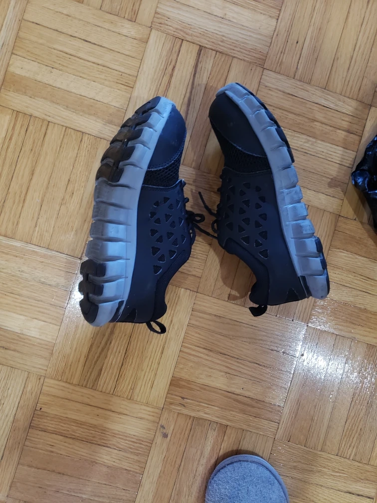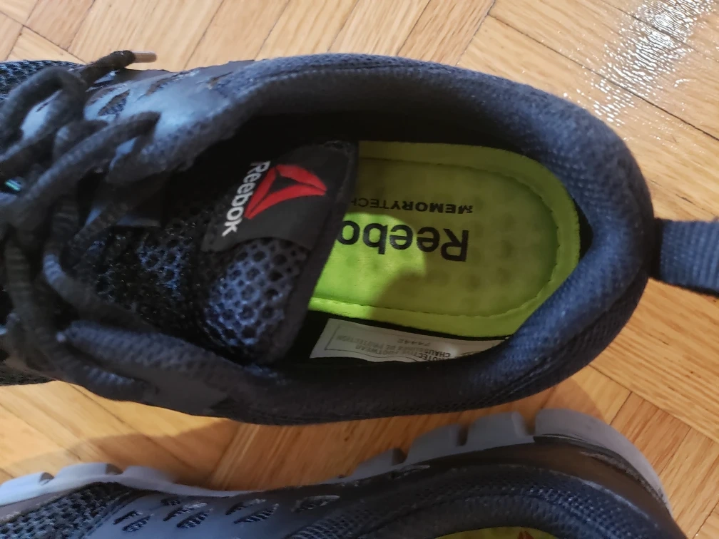 Pair of used Reebok safety shoes. Black mesh upper. Grey sole. Lace-up closure. MemoryTech insole. very good in condition like new