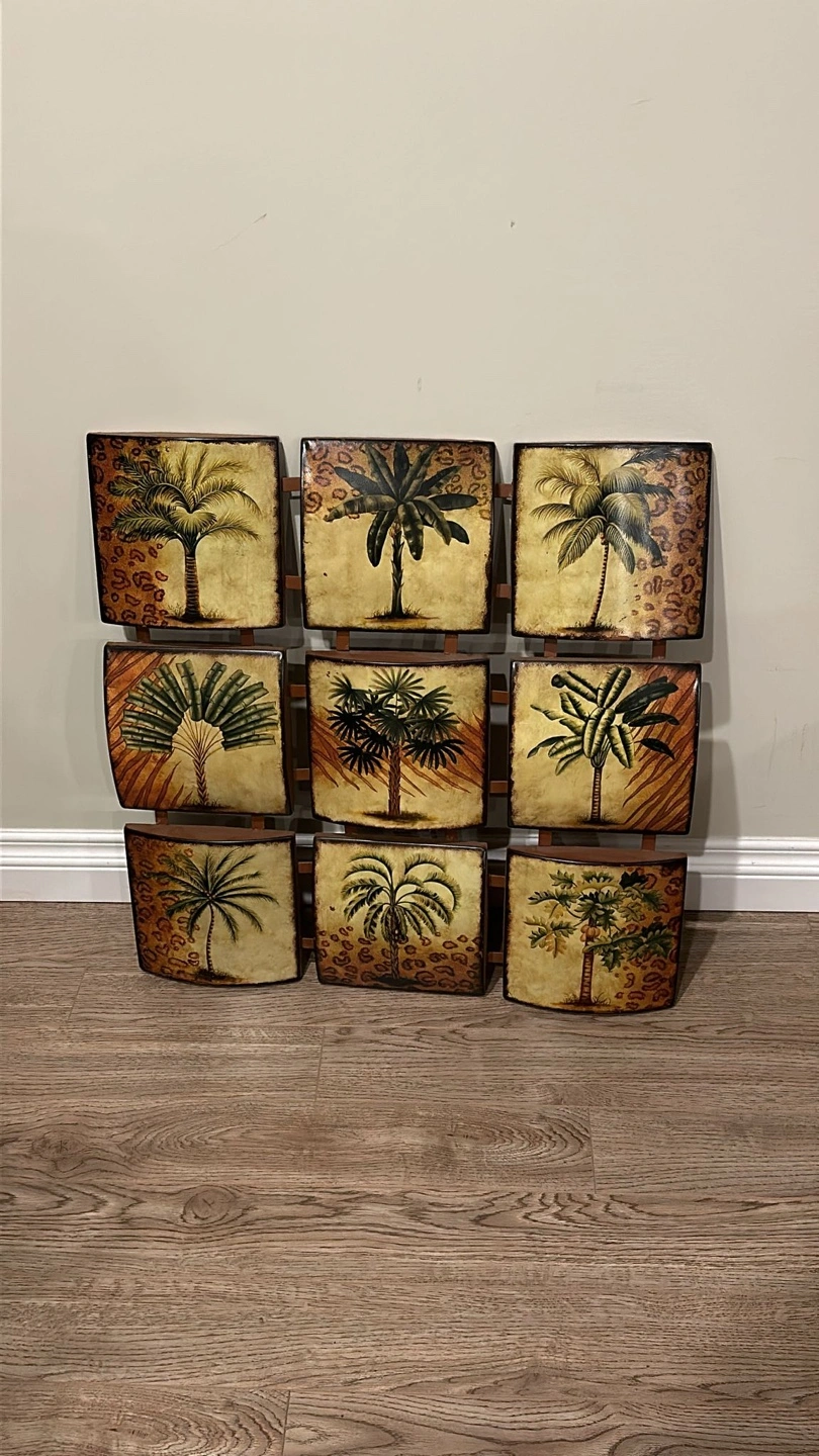 Unique wall hanging. Features nine individual square panels joined together, Each panel shows a different palm tree design. Brown metal frame. Adds a tropical touch to any room. Pick up in Evanston