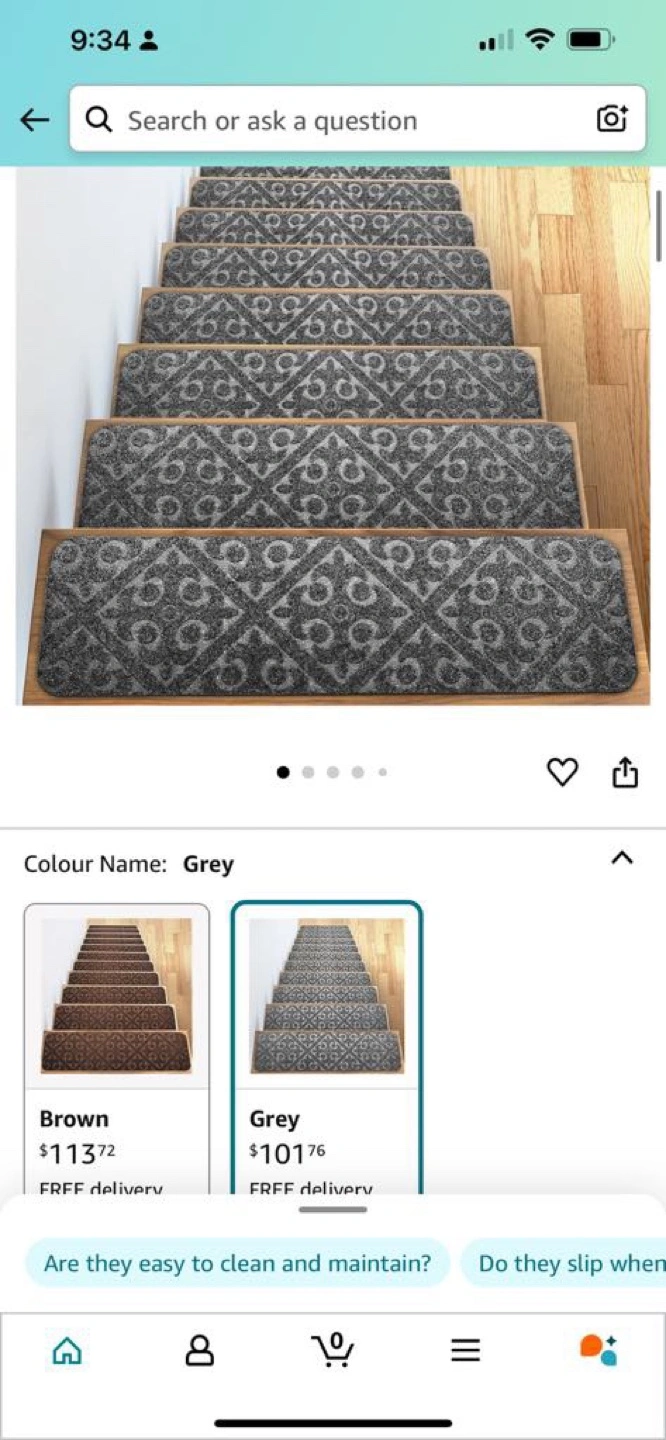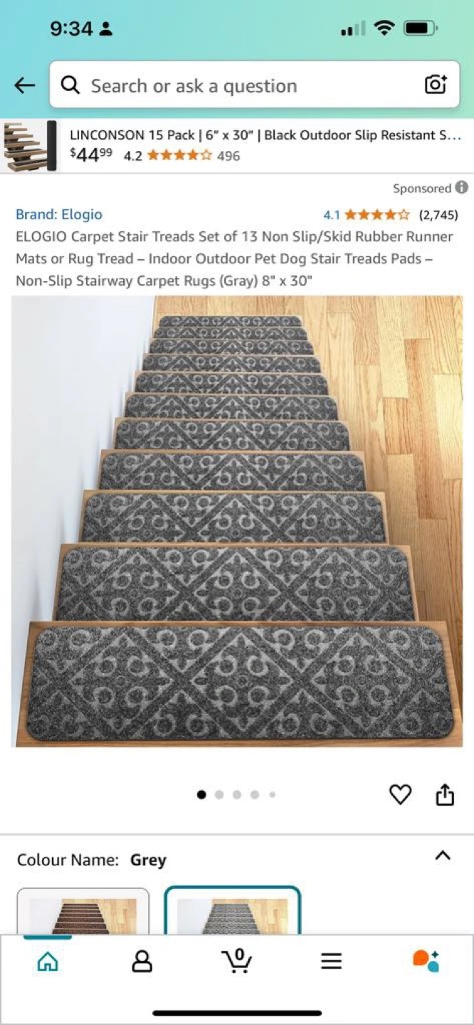 Set of 13 grey stair treads. Non-slip. Indoor or outdoor use. Pet friendly. 8" x 30".