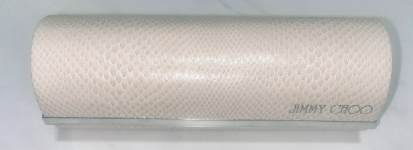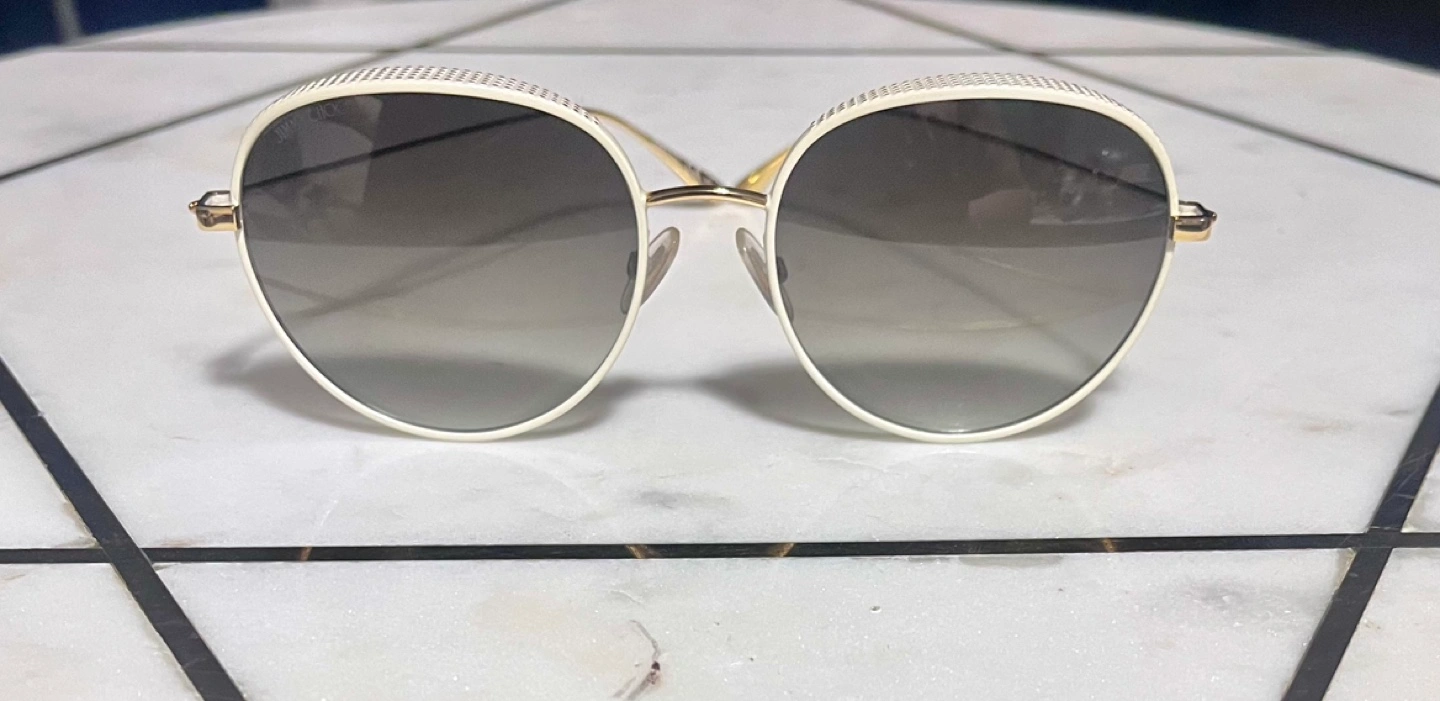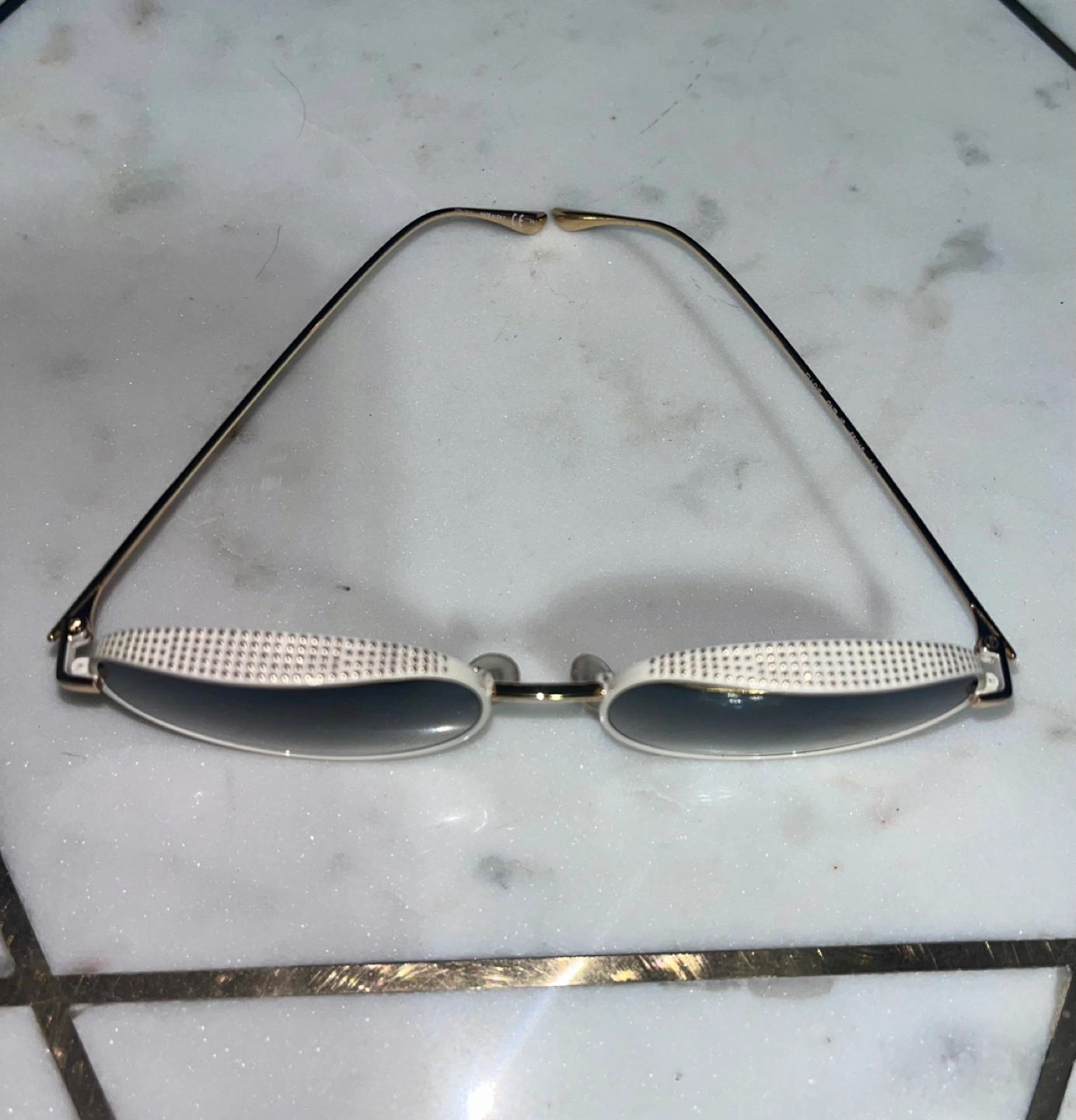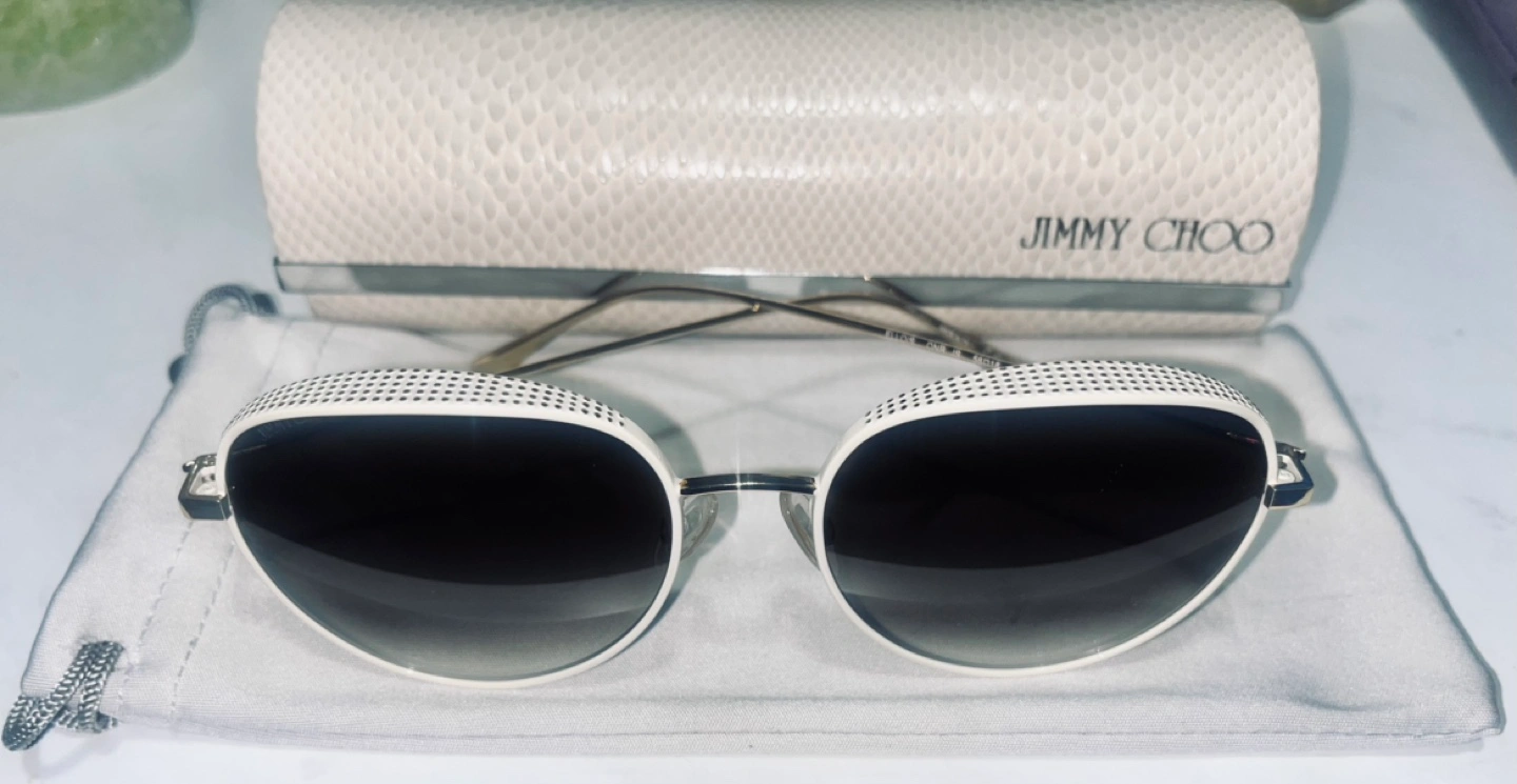 White and gold Jimmy Choo sunglasses. Round lenses with gradient grey shading. Perforated detailing on the frames. Gold arms.