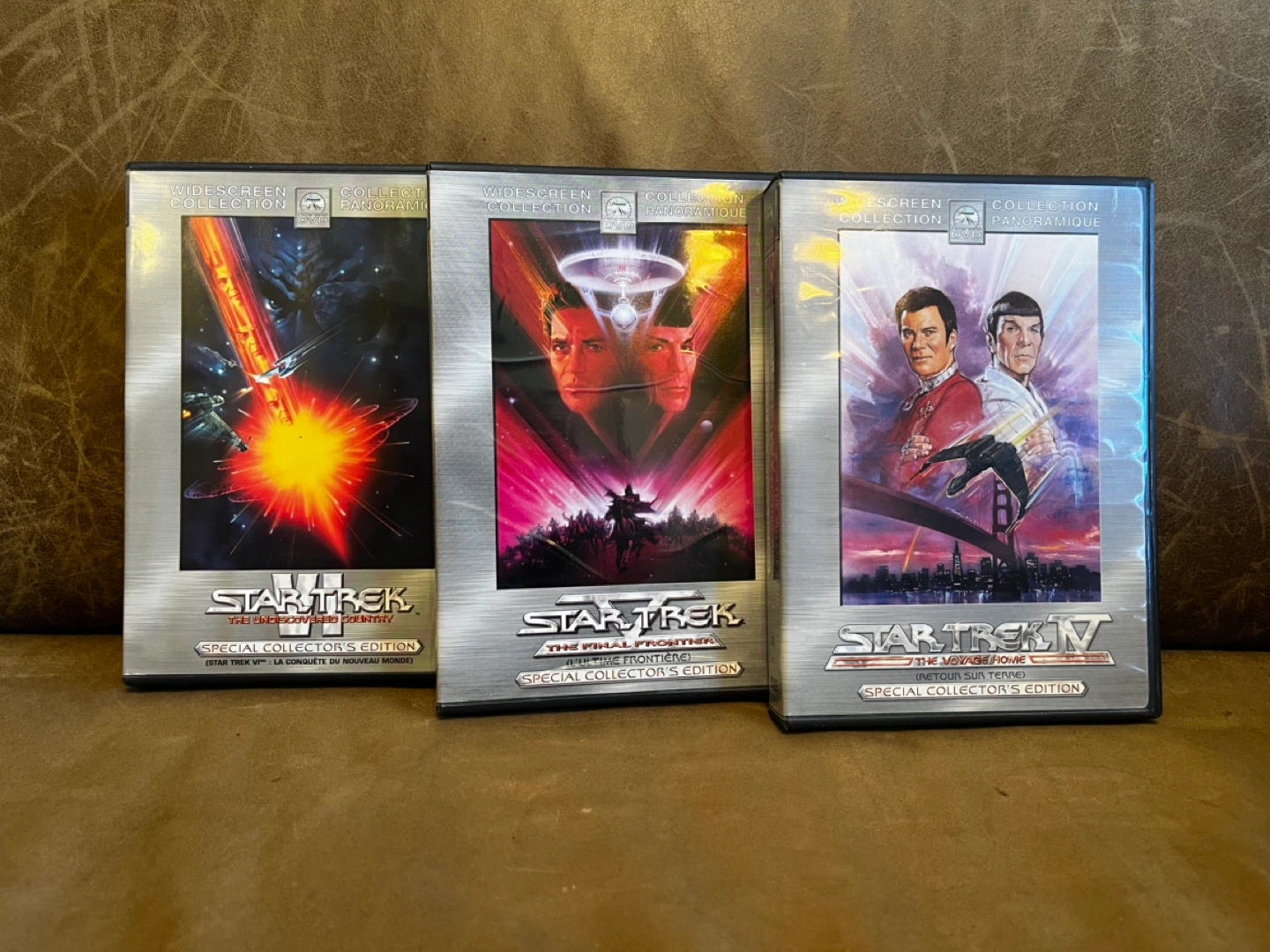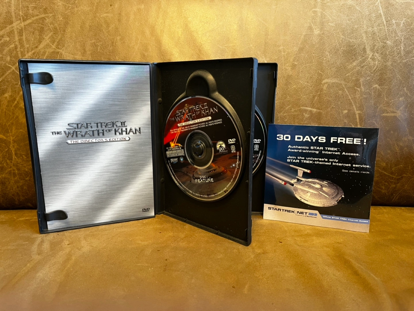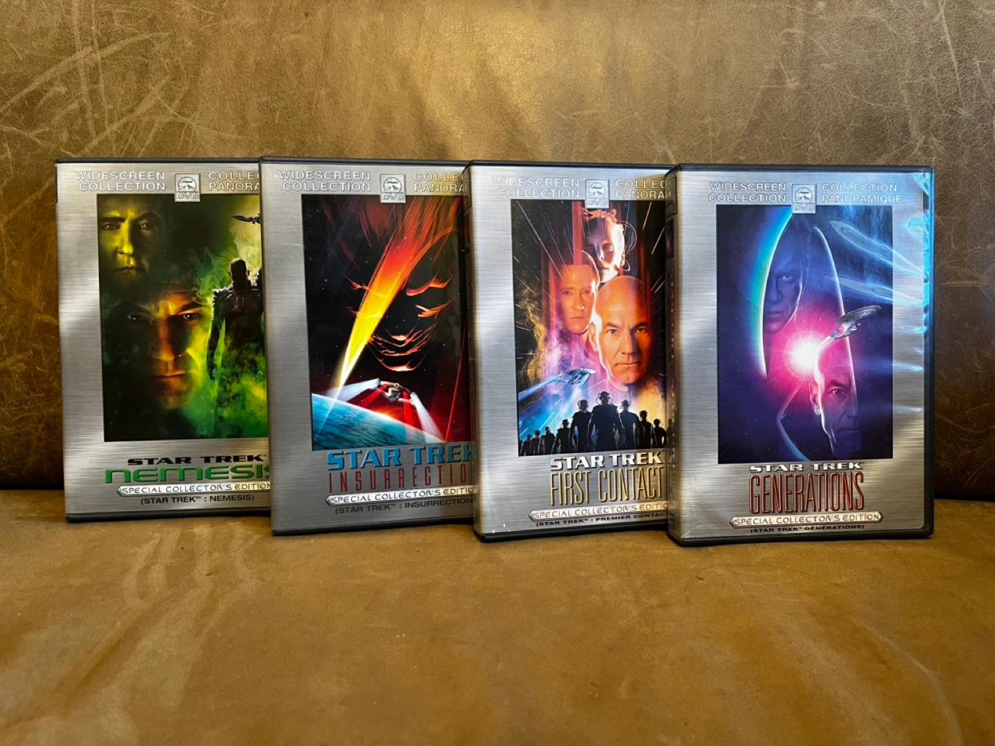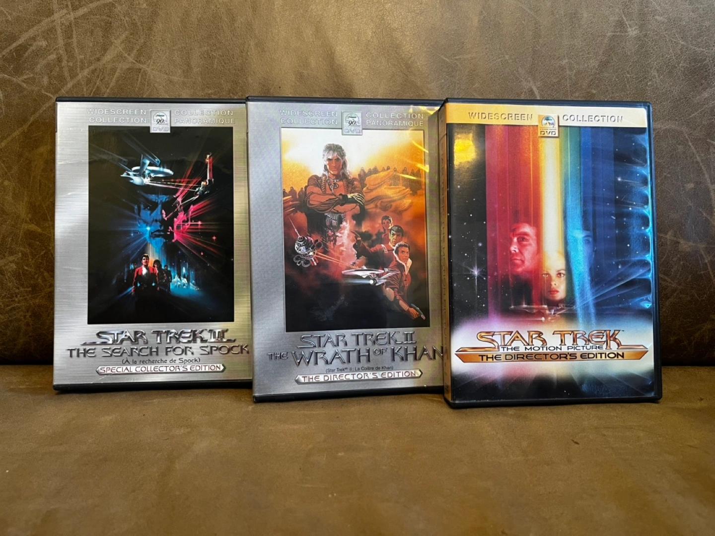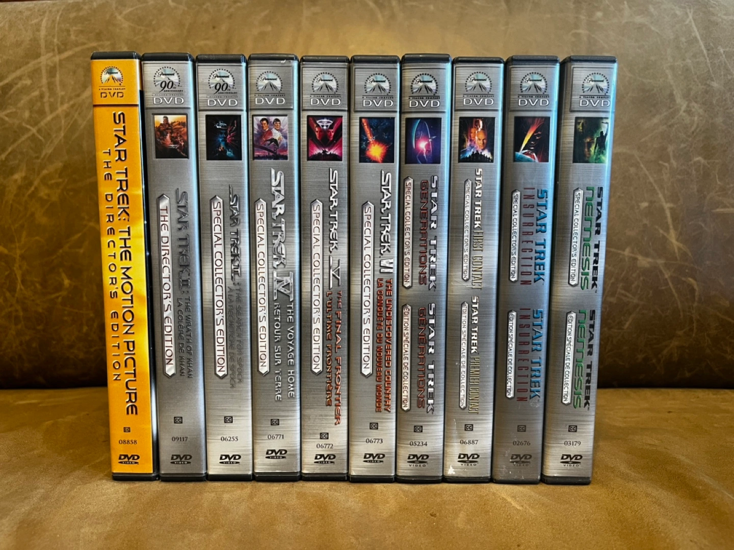 All discs play perfectly. No scratches on discs. All original inserts are included. Cases are in perfect condition. Includes 10 movies and 20 discs. All movies are either Director's or Special Collector's editions which include a movie disc in widescreen and a disc of extras. Movies included: Star Trek: The Motion Picture (1979) The Director's Edition Star Trek II: The Wrath of Kahn (1982) The Director's Edition Star Trek III: The Search for Spock (1984) Special Collector's Edition Star Trek IV: The Voyage Home (1986) Special Collector's Edition Star Trek V: The Final Frontier (1989) Special Collector's Edition Star Trek VI: The Undiscovered Country (1991) Special Collector's Edition Star Trek: Generations (1994) Special Collector's Edition Star Trek: First Contact (1996) Special Collector's Edition Star Trek: Insurrection (1998) Special Collector's Edition Star Trek: Nemesis (2002) Special Collector's Edition