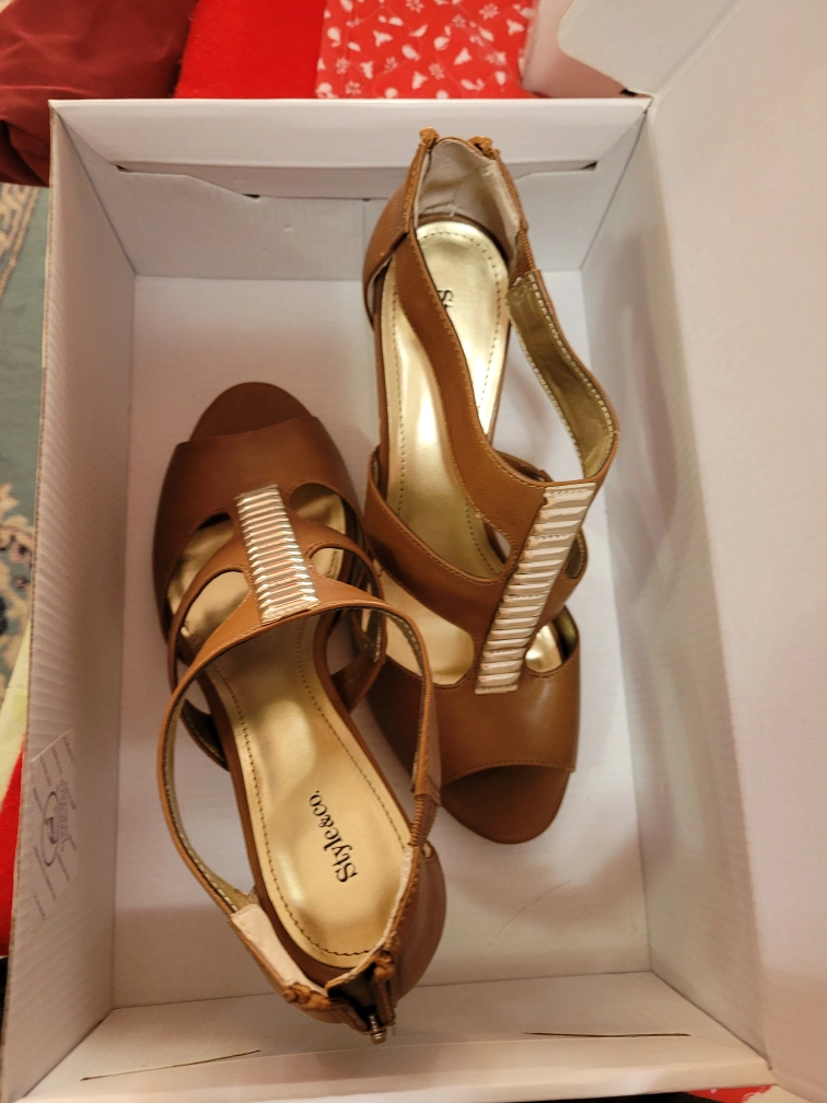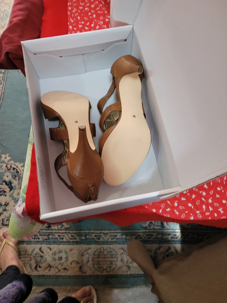 Gorgeous brown leather heels. Open toe and ankle strap design. Slight heel. Size 7.5.