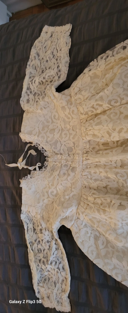 This is a lace and satin christening/ Baptism outfit. I'm not sure of the size. I picked this up at a second-hand store 42-43 years ago. My niece worn it for her baptism. This could become a family heirloom.