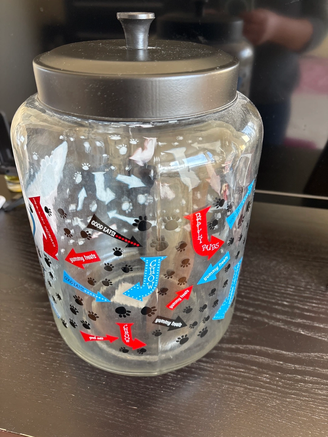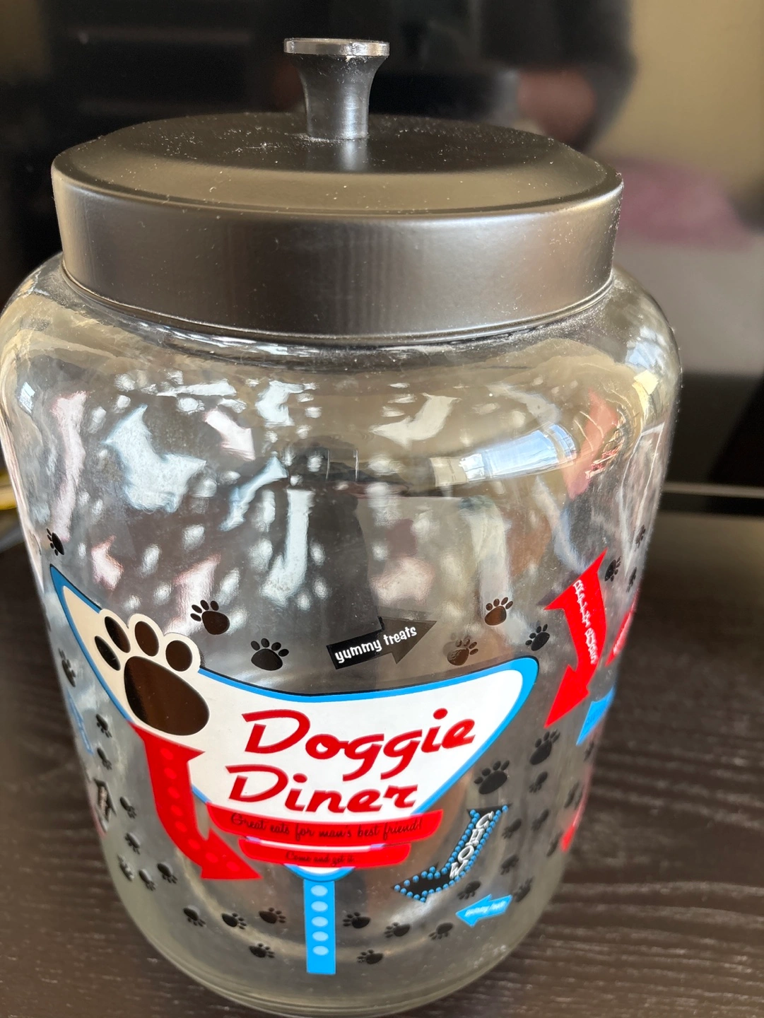 Large glass jar with black lid. Pet food storage. Features a retro diner design. Paw prints and fun phrases.