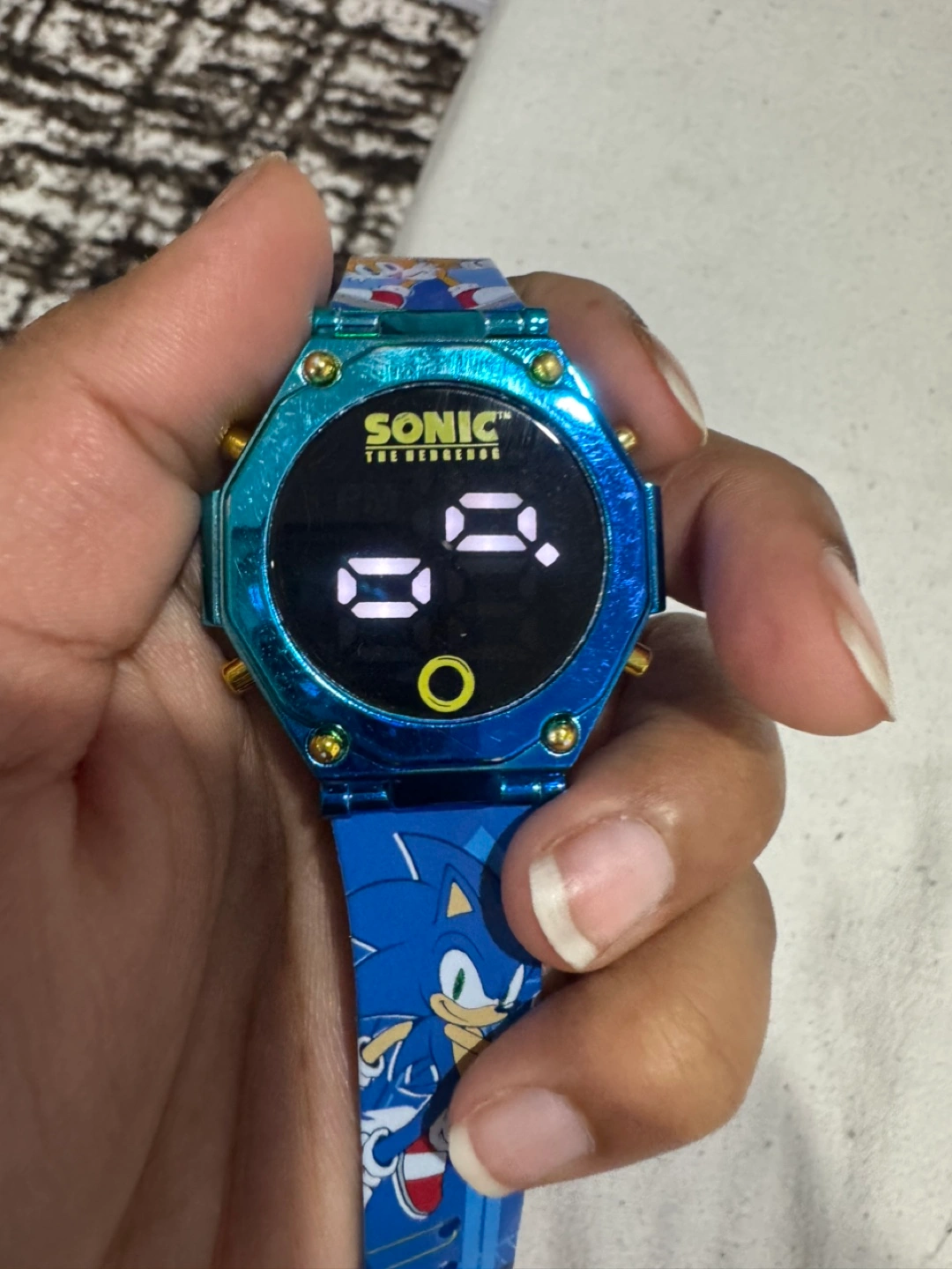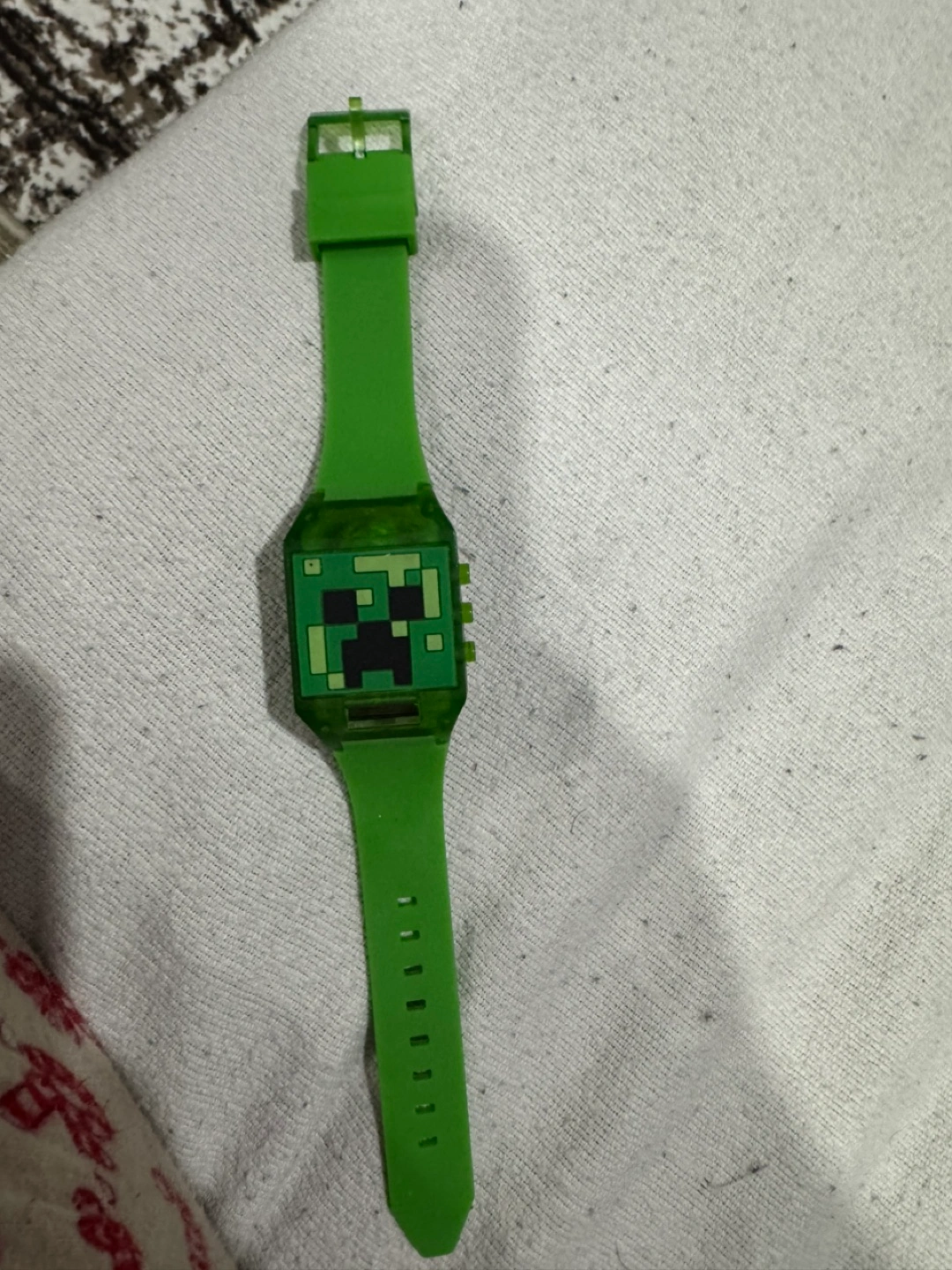 Two kids' watches. One features Minecraft Creeper design, green band. The other shows Sonic the Hedgehog, blue band. Both are digital watches. 10 dollars each