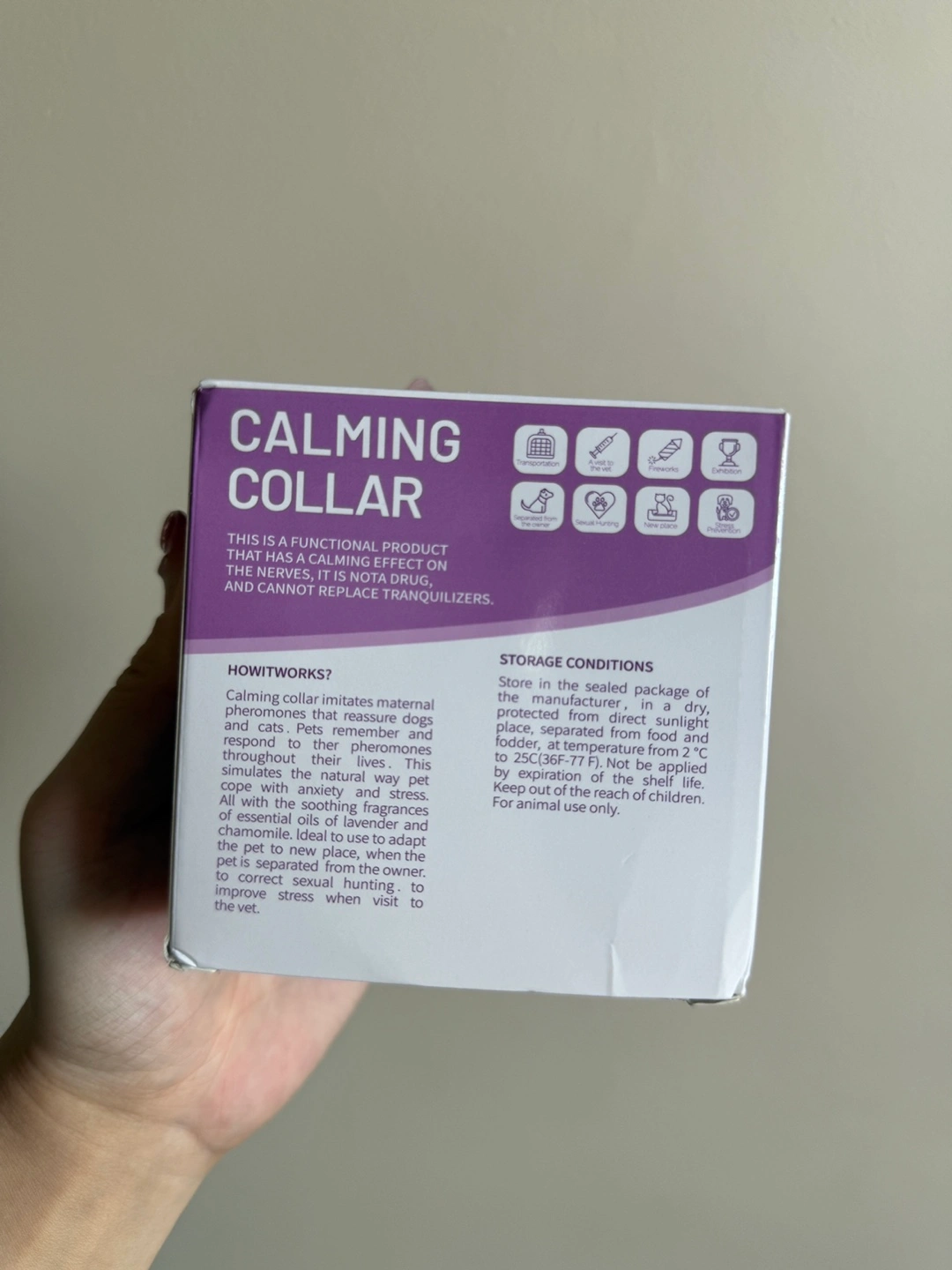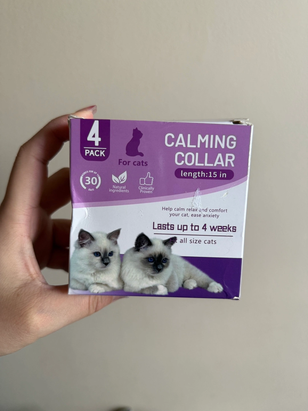 Four calming collars for cats. Each collar measures 15 inches. Helps calm and comfort cats, easing anxiety. Lasts up to four weeks. Made with natural ingredients. I opened one but the rest 3 are unopened. Cats dont need it anymore