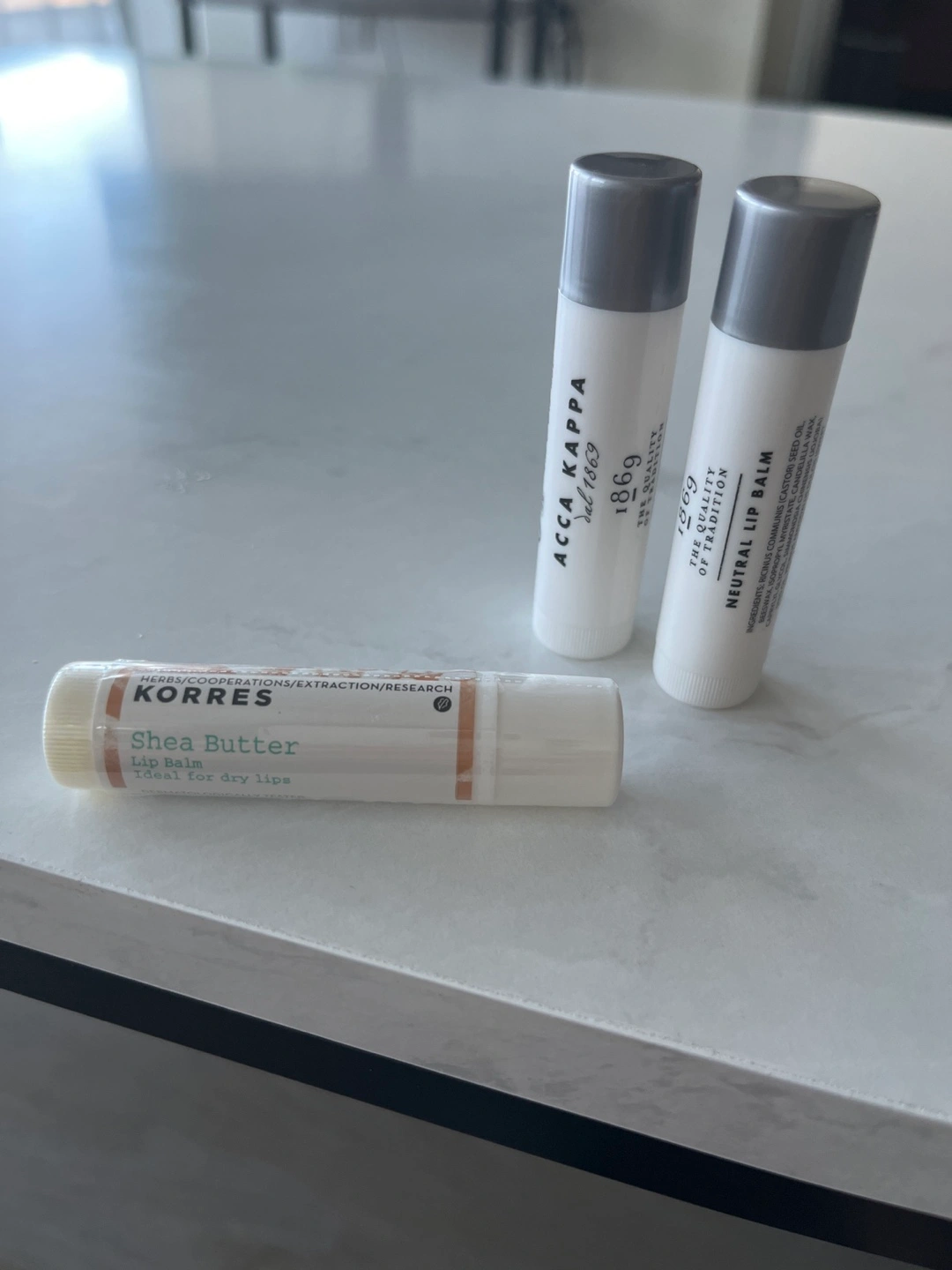 Set of three lip balms. One Korres Shea Butter lip balm, ideal for dry lips. Two Acca Kappa Neutral lip balms. Korres has plastic wrapping, others don’t but are unused. Korres is from Greece, acca kappa is Italian. Each retail for $15-20. Selling all for $20