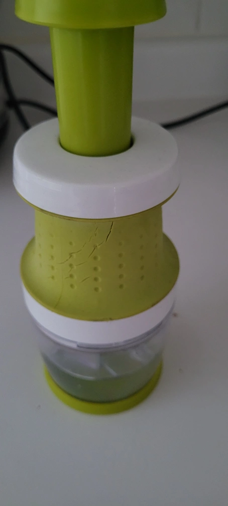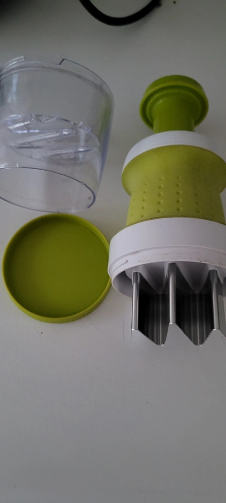 Compact manual food chopper. Features a transparent container, green and white plastic housing, and stainless steel blades. Great for chopping vegetables and herbs. Minor crack on the body.