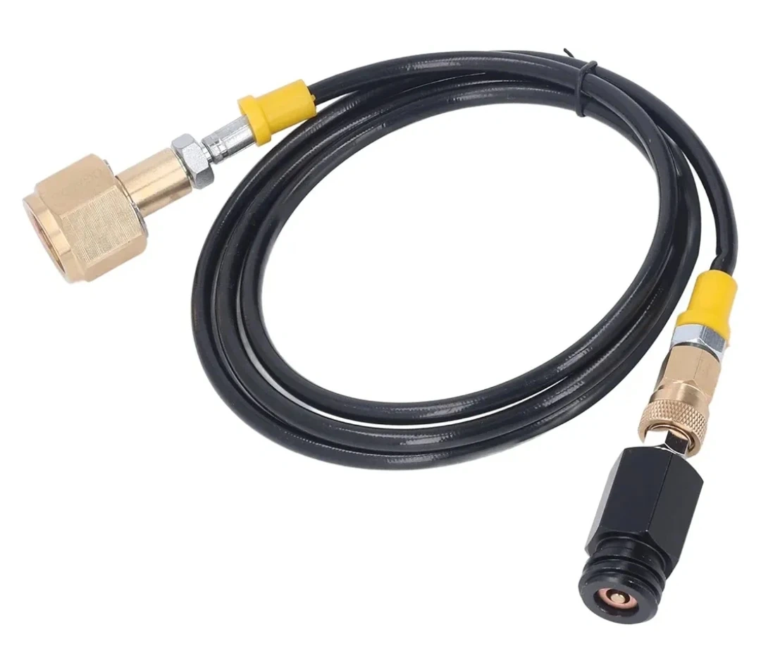 Black rubber hose assembly. Brass fittings on both ends. Yellow coloured protective sleeves on connectors. Suitable for various gas cylinders.