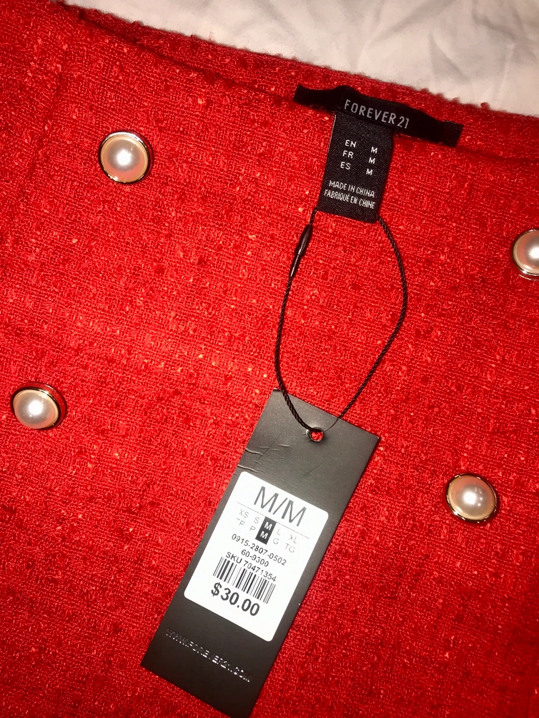 - Brand new with tag - Red tweed mini skirt - Size medium - Features pearl buttons and side slits