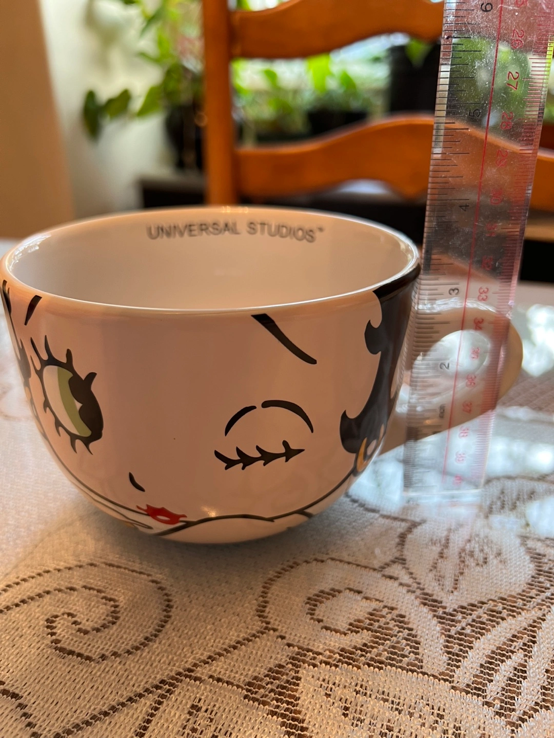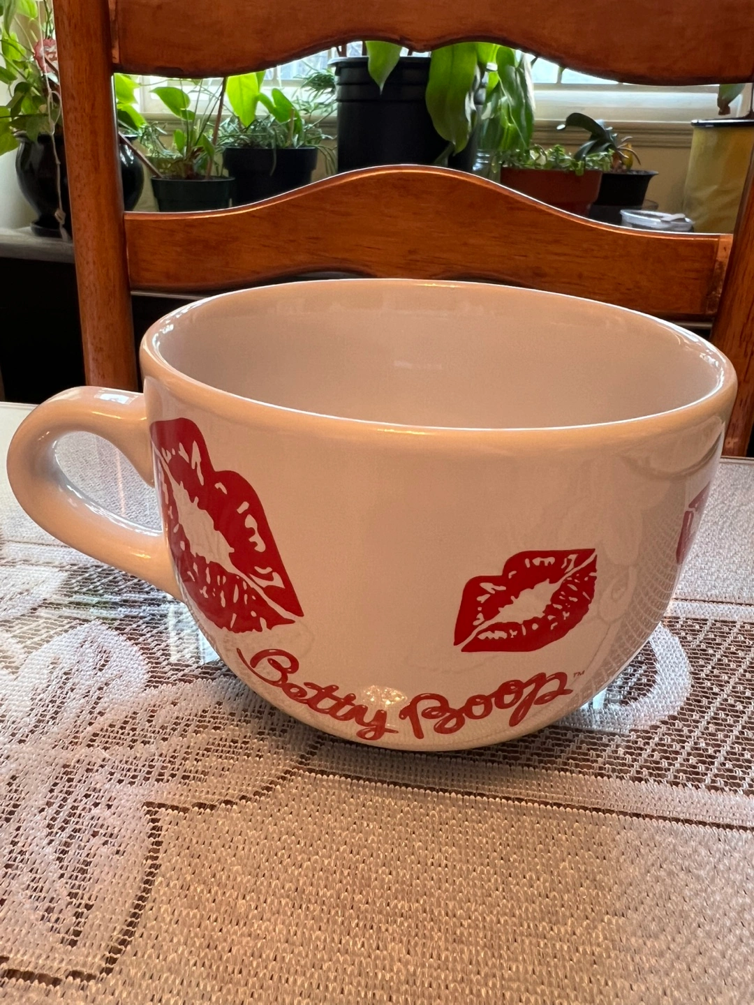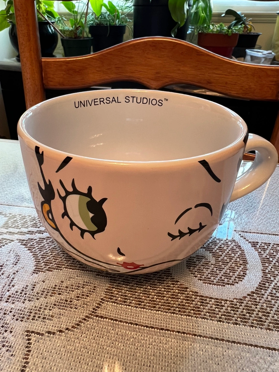 Extra large Betty Boop mug. Features red lips and Betty Boop's face. Microwave and dishwasher safe. Purchased for $35 USD at the Universal Studios Hollywood in Los Angeles. Can sell for $20 or trade for a 16 oz Starbucks collector mug.