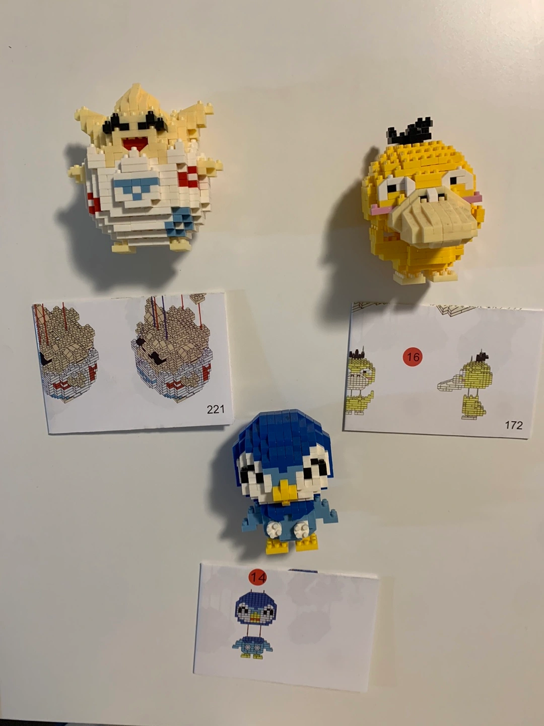 Three adorable Pokemon mini figures built with small blocks. Perfect for collectors or children. Includes Piplup, Psyduck, and Togepi. Instructions included.