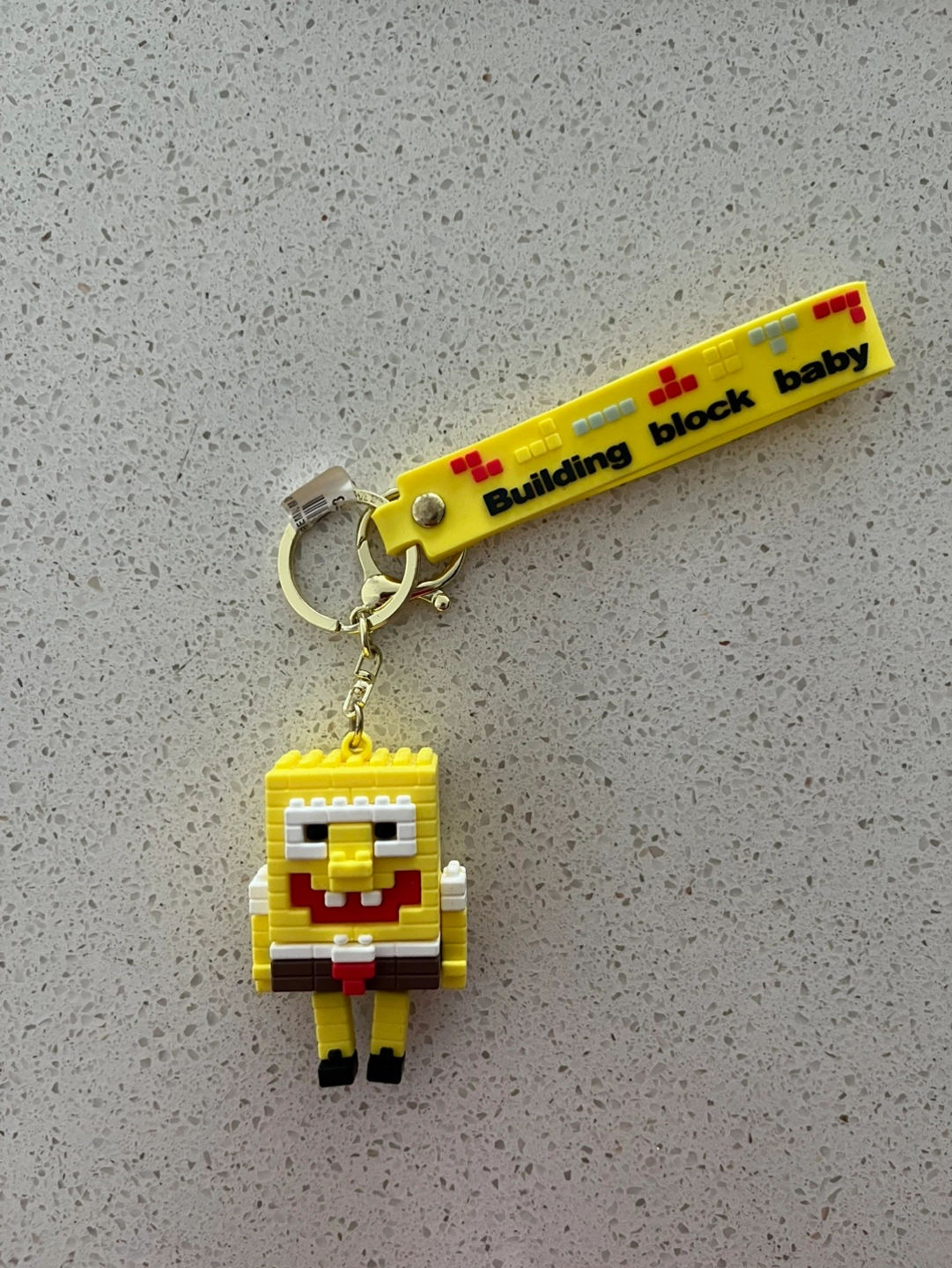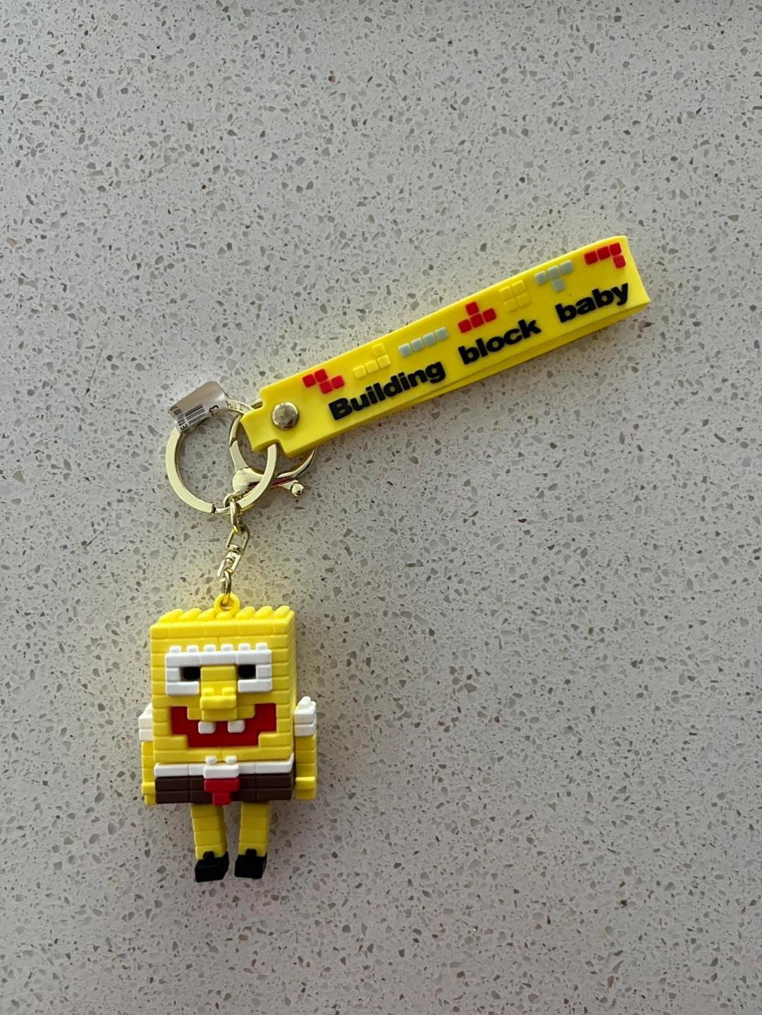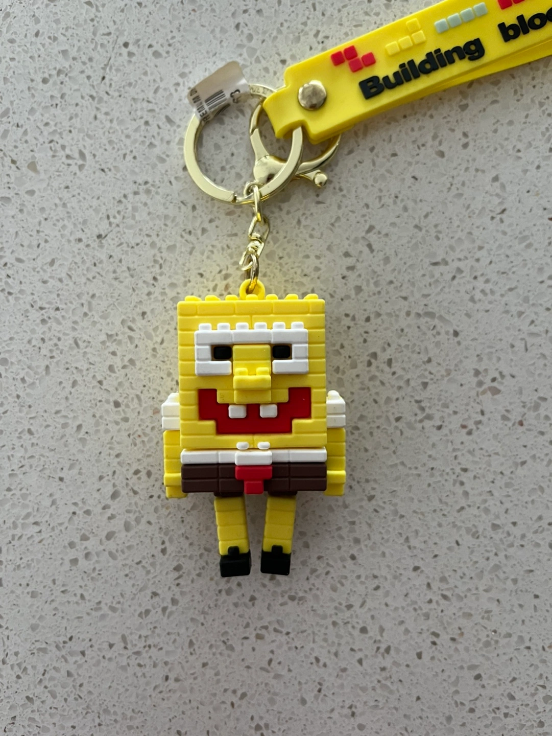 Adorable Spongebob keychain. Building block design. Features a yellow Spongebob charm and a yellow strap. Perfect for fans!
