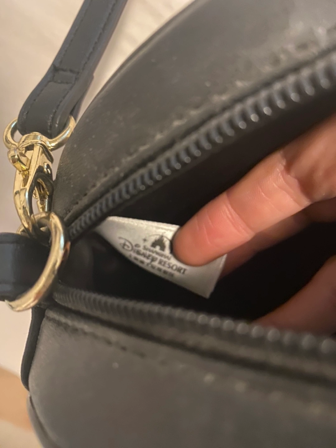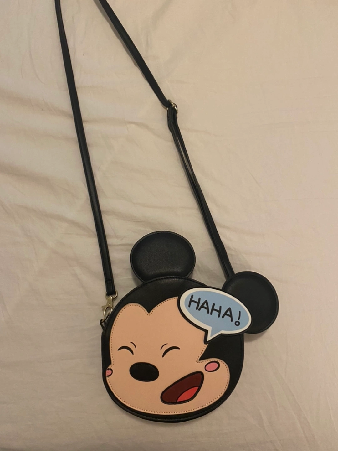Adorable Mickey Mouse crossbody bag. Round shape. Bought at Shanghai Disney resort Features a playful Mickey face. Black faux leather. Adjustable strap. Zipper closure.