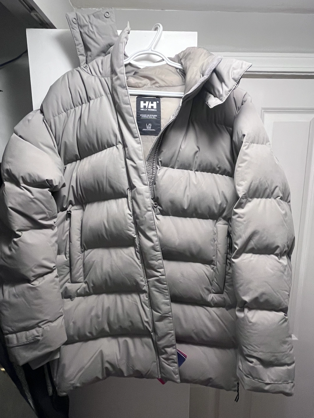 Women's grey puffer jacket. Large size. Attached hood. Side pockets. Brand New with Tags
