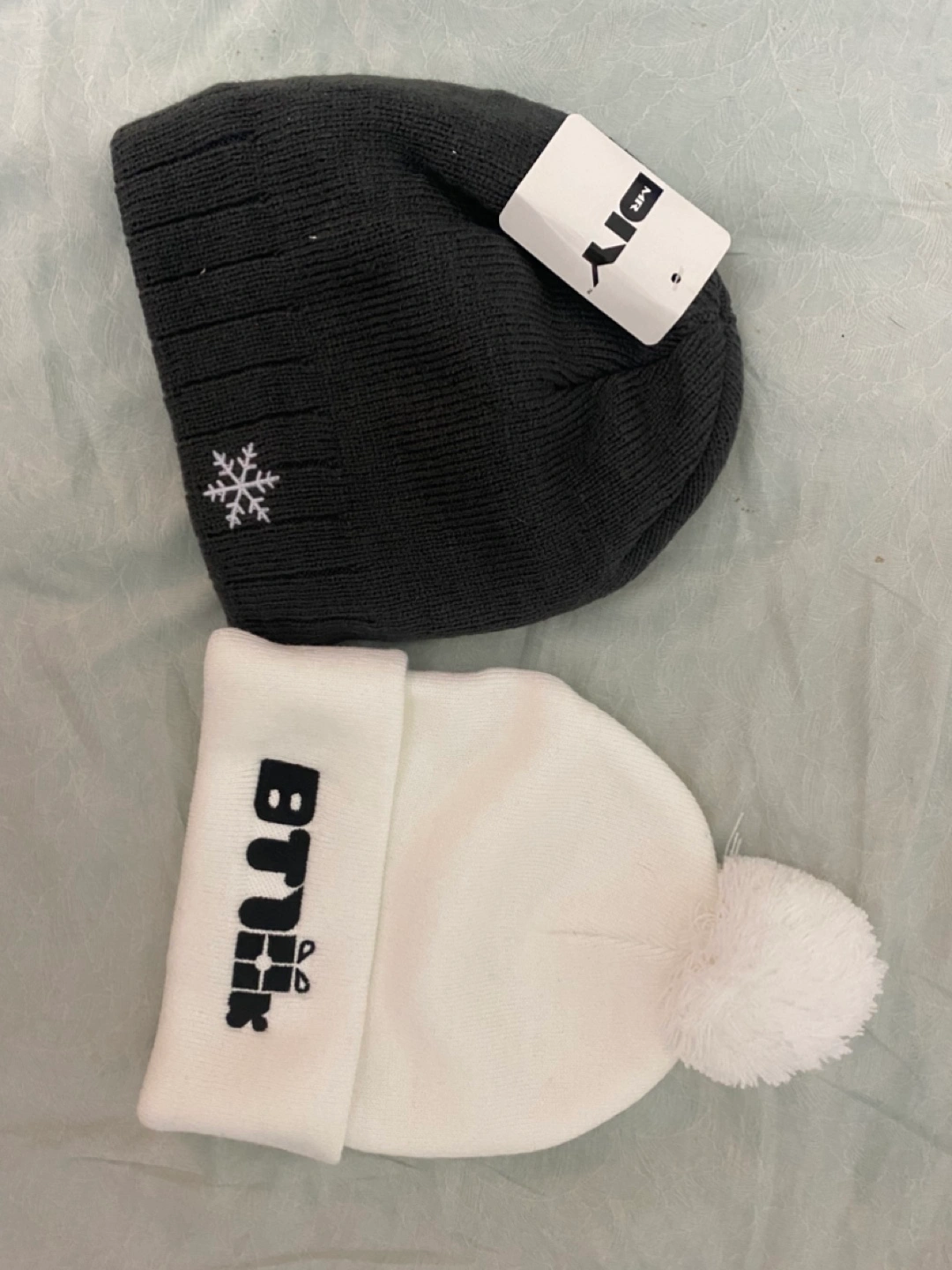 Set of two knit winter hats. One grey hat features a snowflake design. One white hat is from Blacktoe Running. Great for cold weather. $5 for both