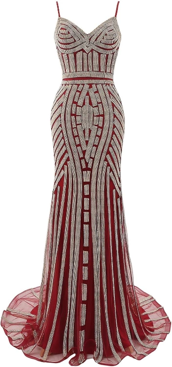 Gorgeous, floor-length gown. Maroon fabric with intricate silver beading. Fitted bodice and a dramatic fishtail skirt. Perfect for prom, a wedding, or special occasion.