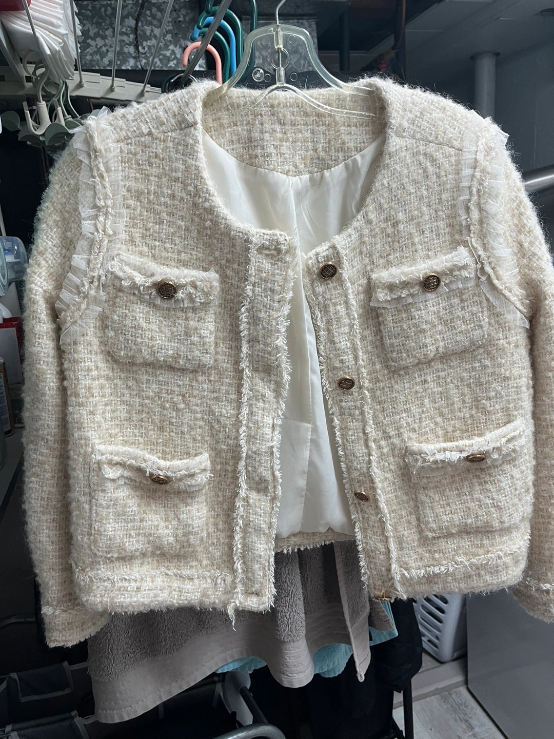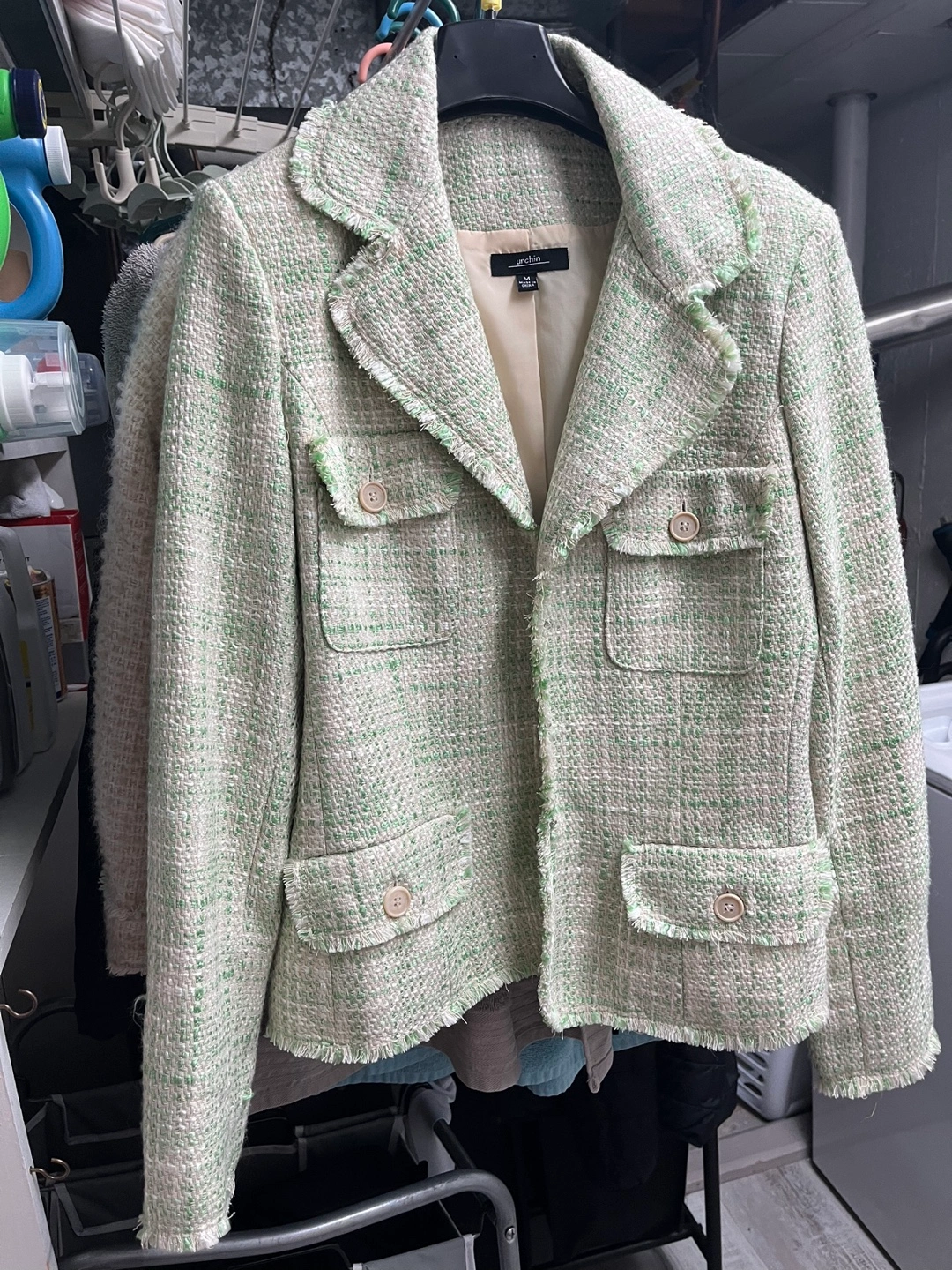 Like New Gorgeous tweed jacket. Features frayed edges, flap pockets, and gold-toned buttons. Lined. Excellent condition.