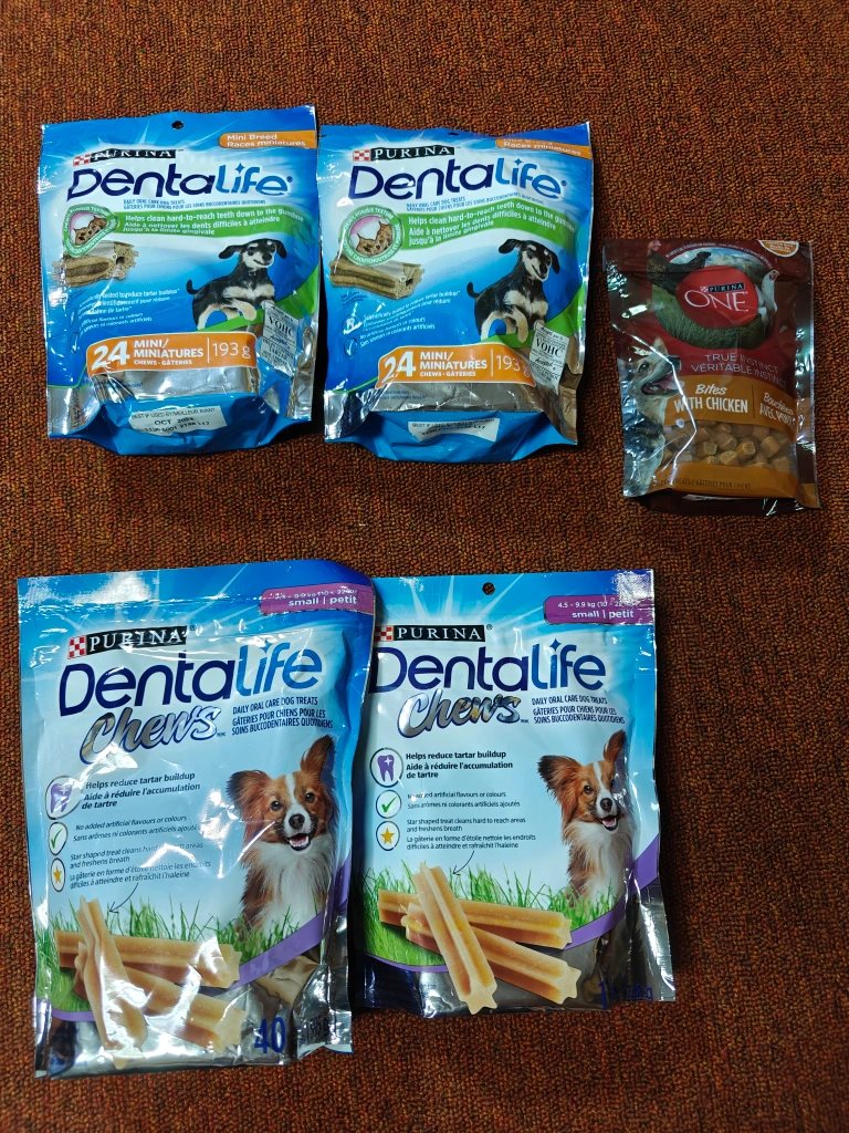 Brand new DentalLife Mini (24 chews per pack) - $1 each - expires Oct 2024 DentalLife Small (17 chews) - $1 - expires Aug 2024 DentalLife Small (40 chews) - $2 - expires Aug 2024 Purina One Bites with Chicken - $2 - expires Jul 2024 All for $5
