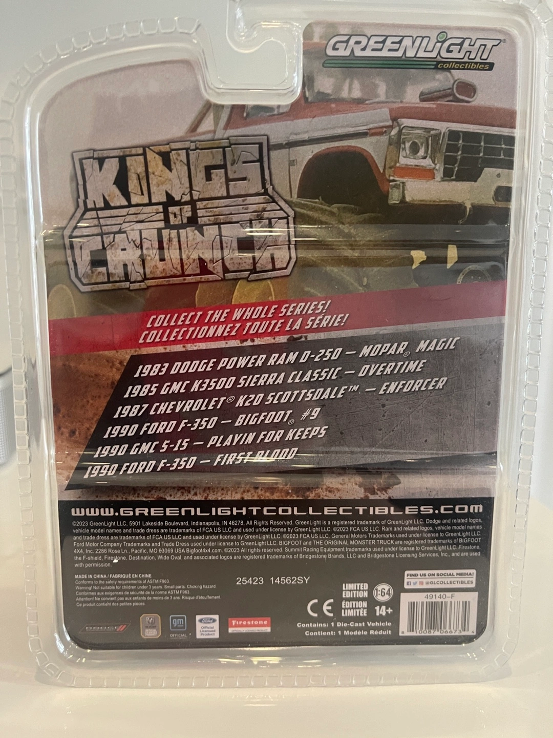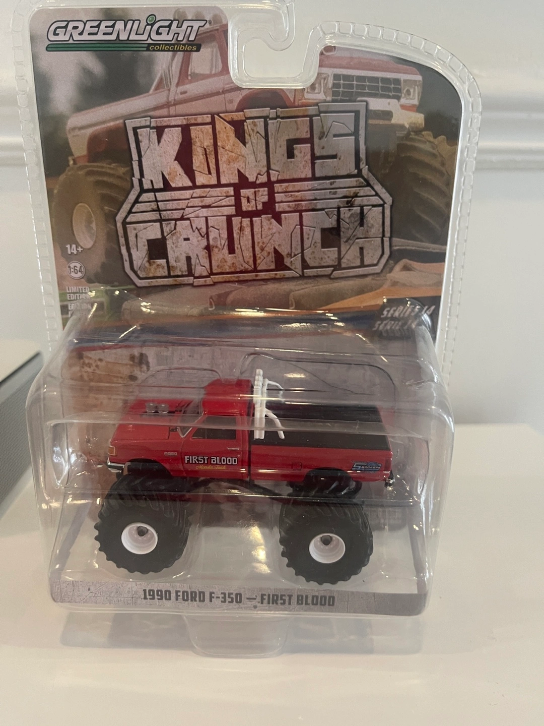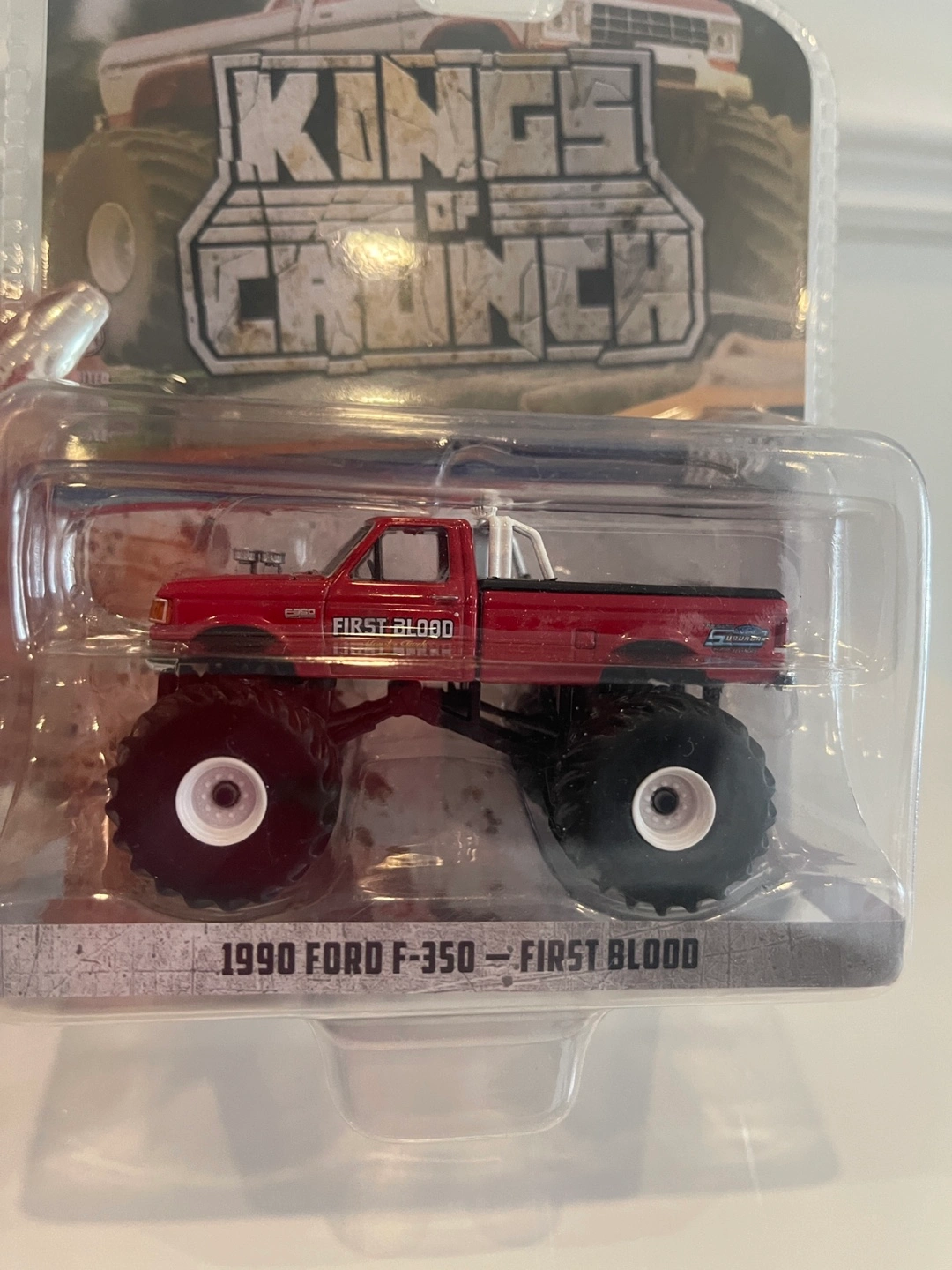 1:64 scale diecast monster truck. Kings of Crunch series. Red 1990 Ford F-350 First Blood. Limited edition collectible. New in package. Thickson and Dundas Whitby