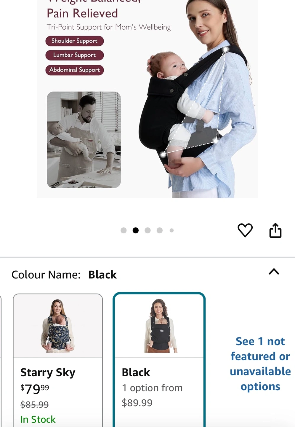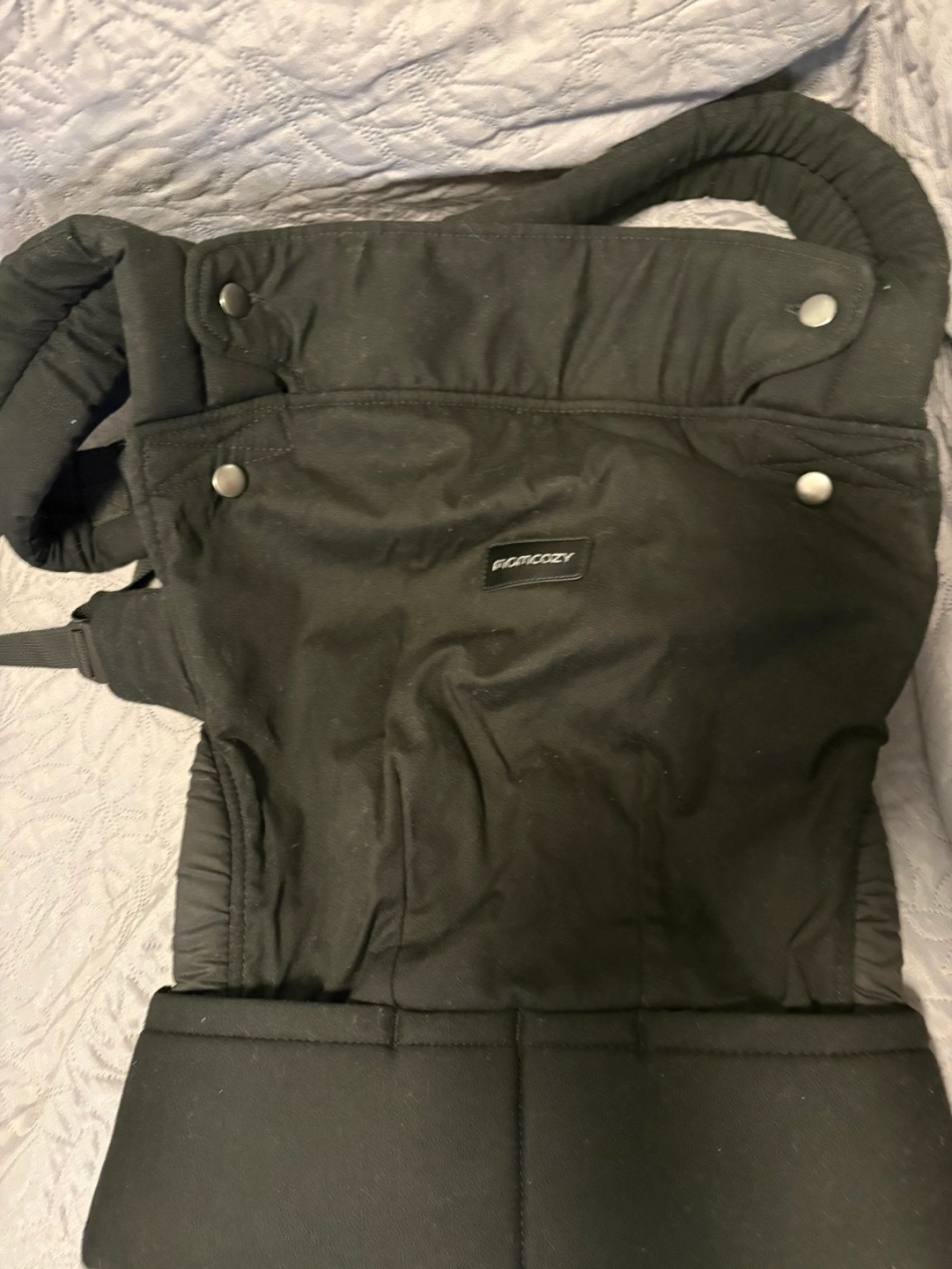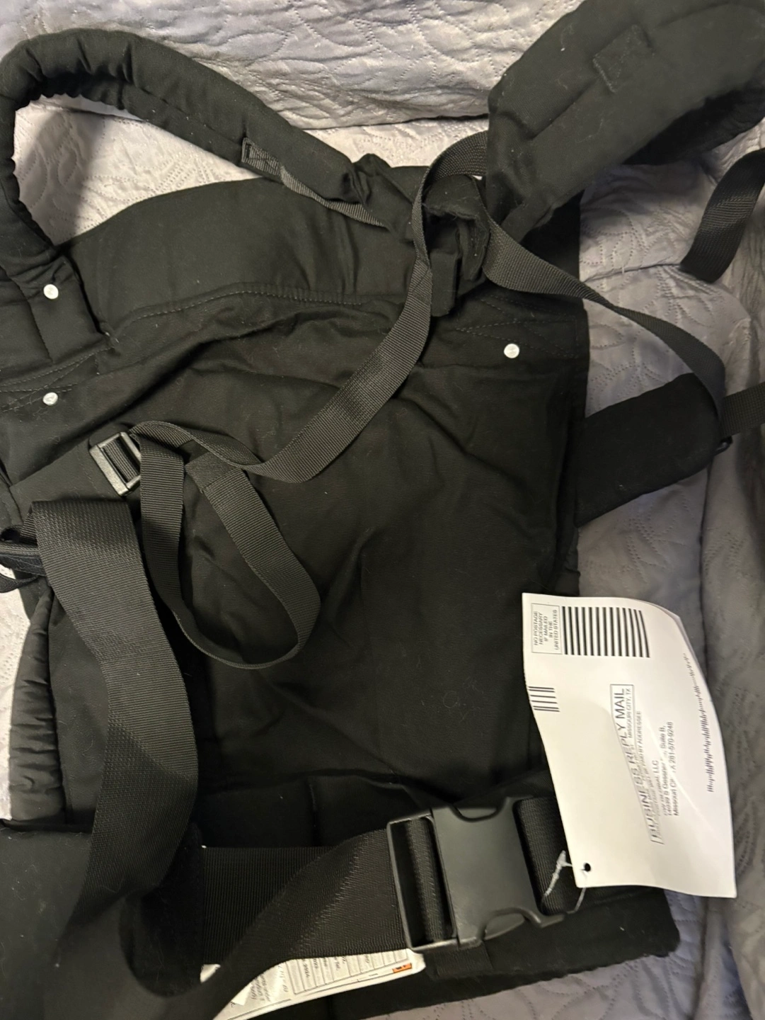 Black baby carrier. Excellent support for baby and parent. Multiple carrying positions. Adjustable straps.