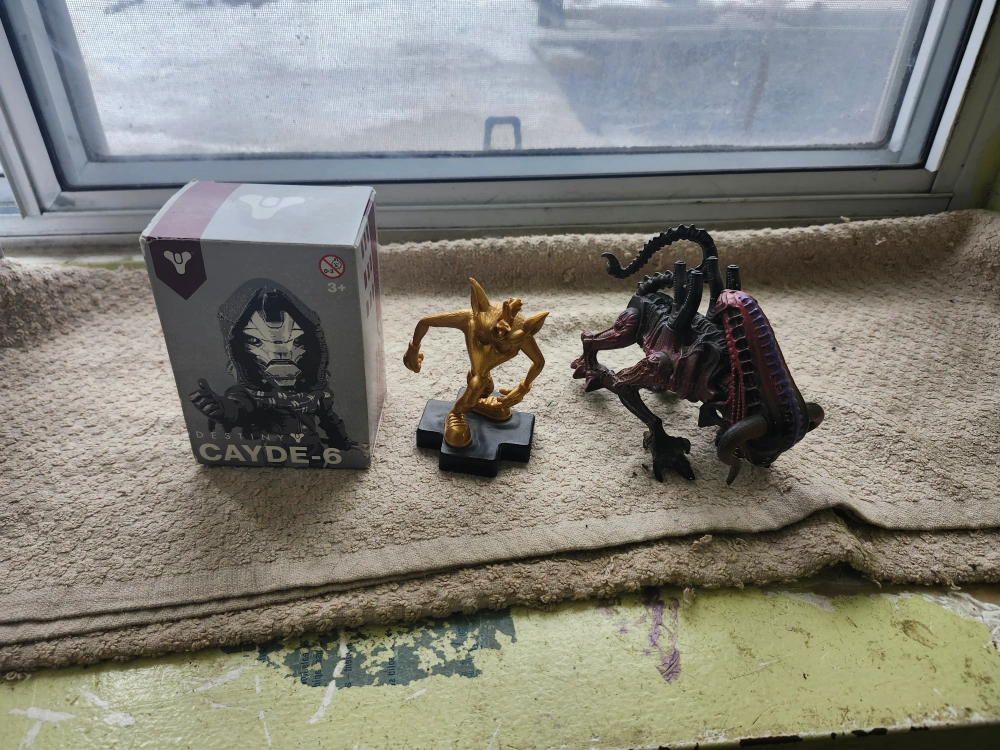 Three collectible figurines. Cayde-6 from Destiny in original box. Gold crash bandicoot and an alien creature. All appear to be in good condition.