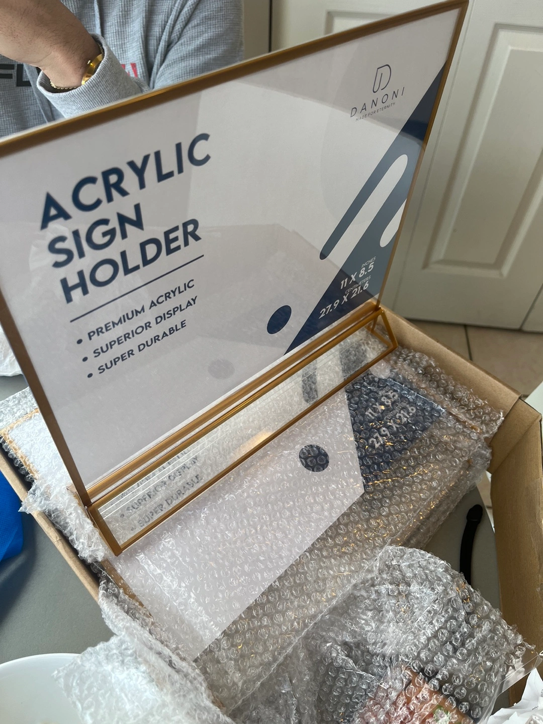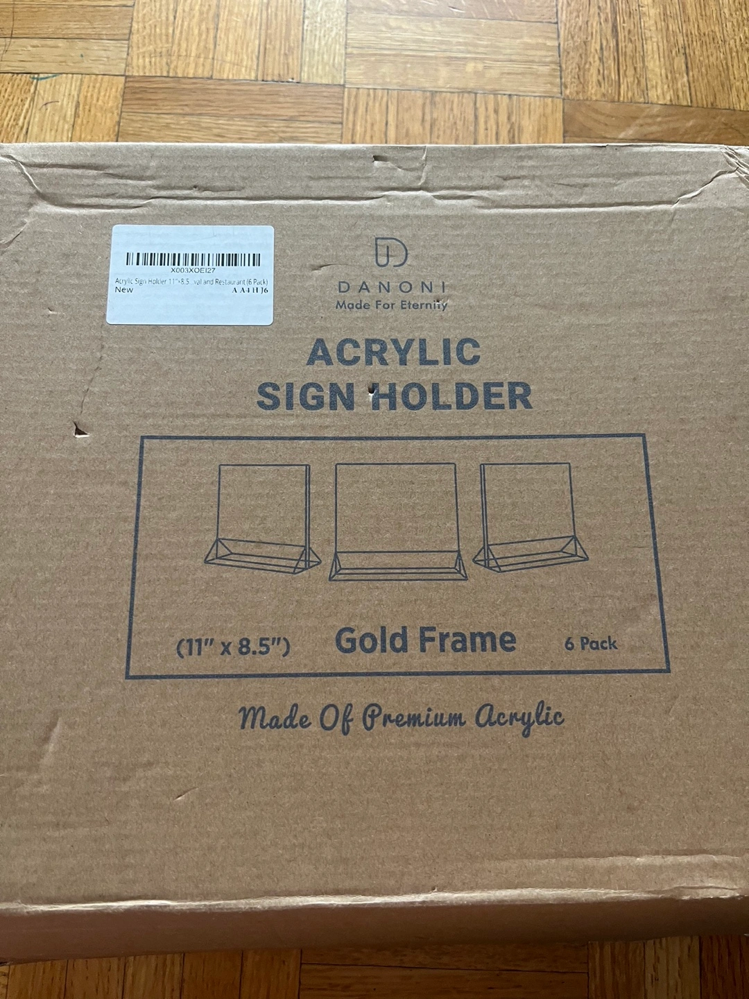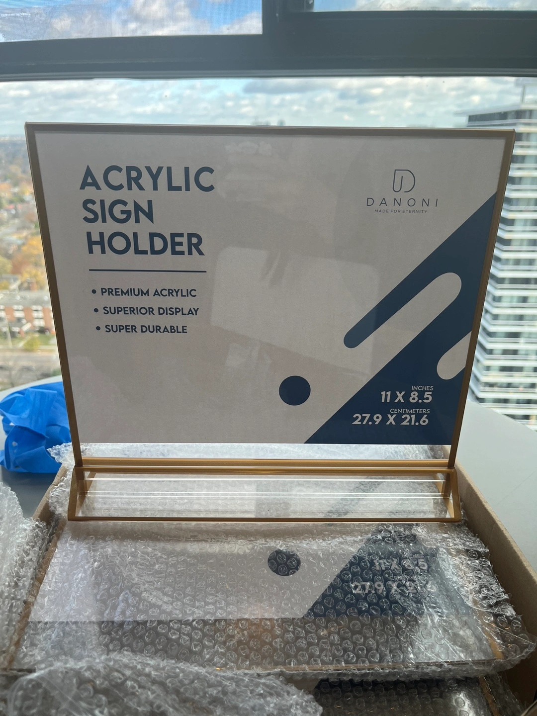 New in box. Premium acrylic. Superior display. Super durable. Gold frame. Perfect for restaurants and retail. 11 inch x 8.5 inch