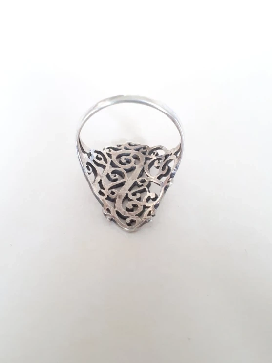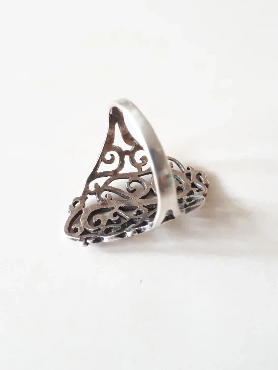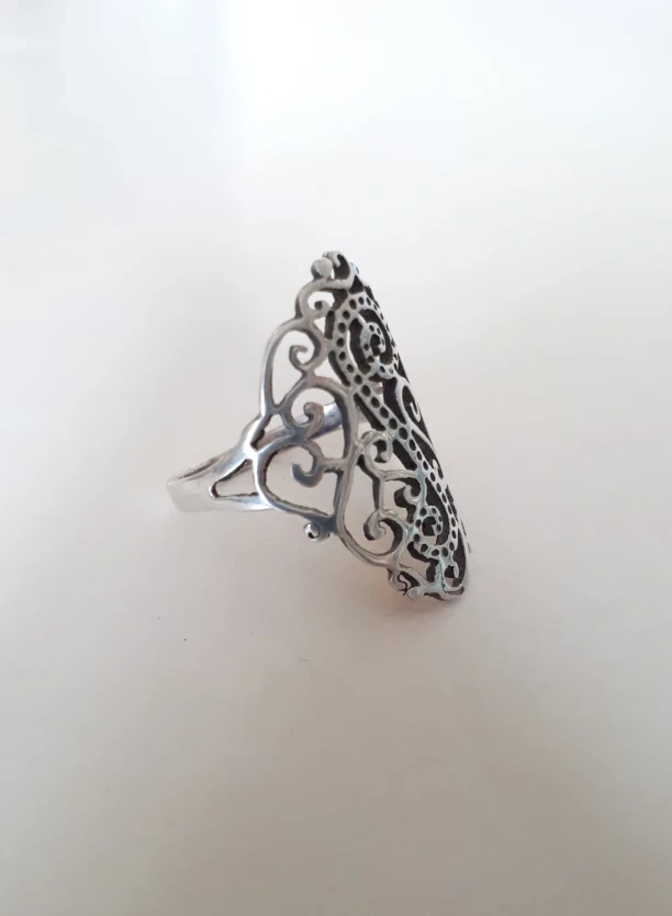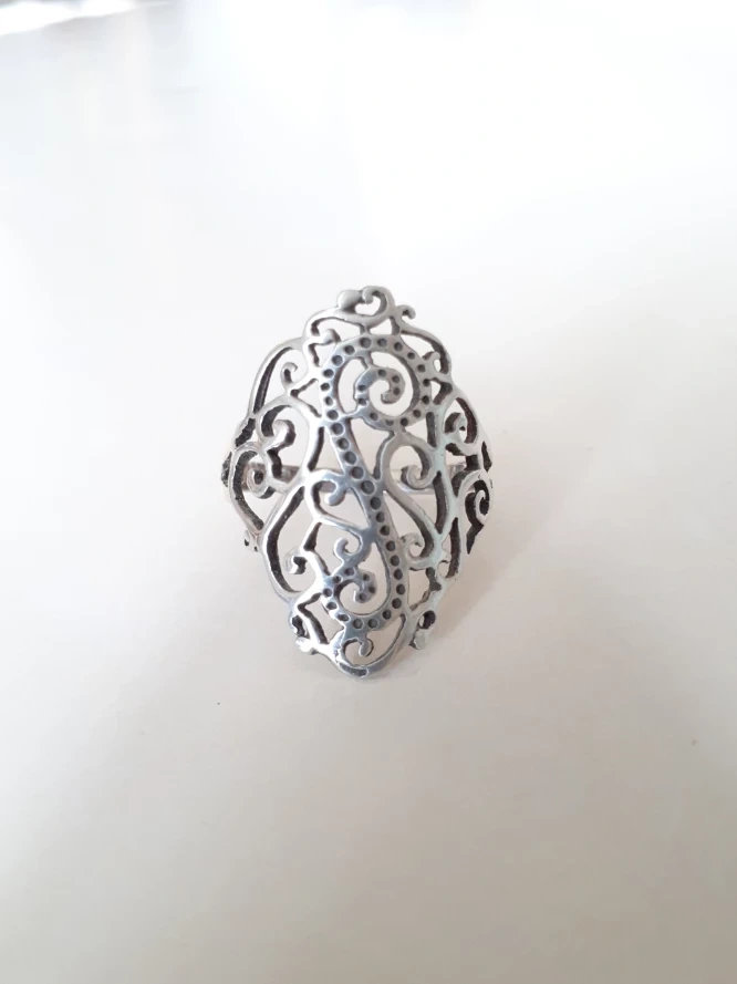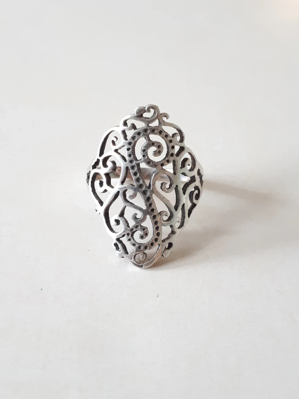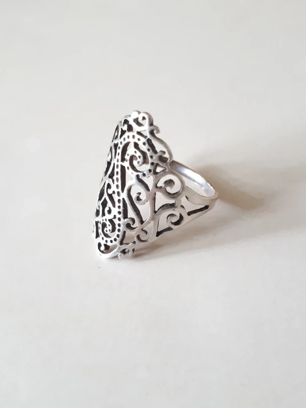 Sterling silver ring featuring ornate scroll-work. Large, yet very comfortable to wear since it has a flat profile (lies flat), is smooth and well made. Sterling silver, see 925 stamp in last photo 📷. Ring size: fairly large, approx 8.5. Condition: as new.