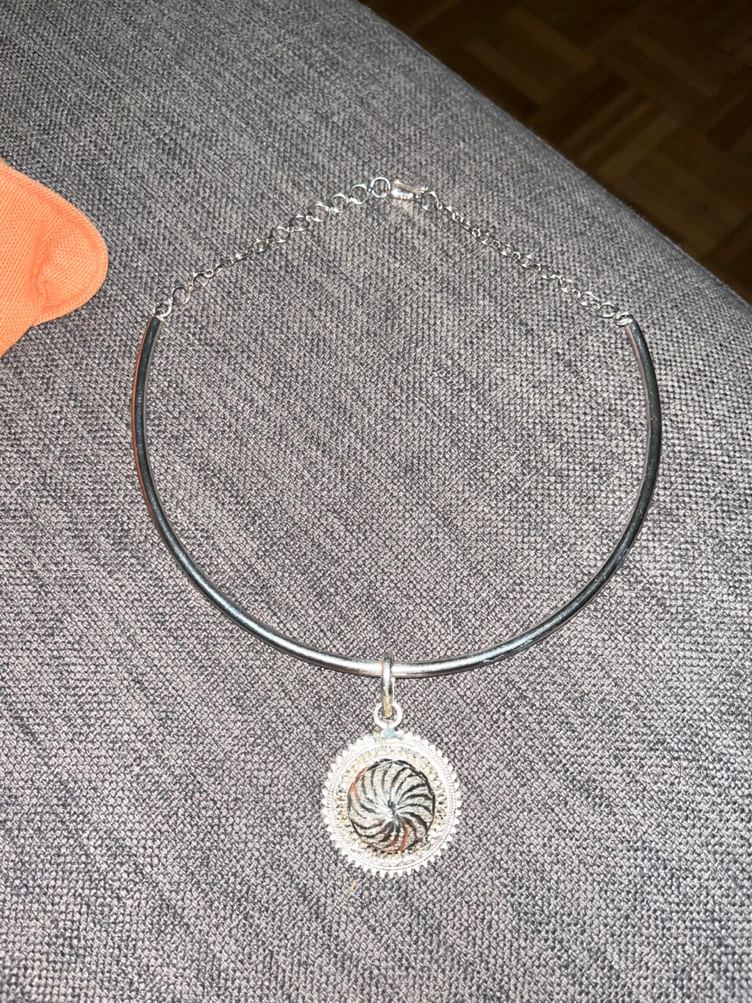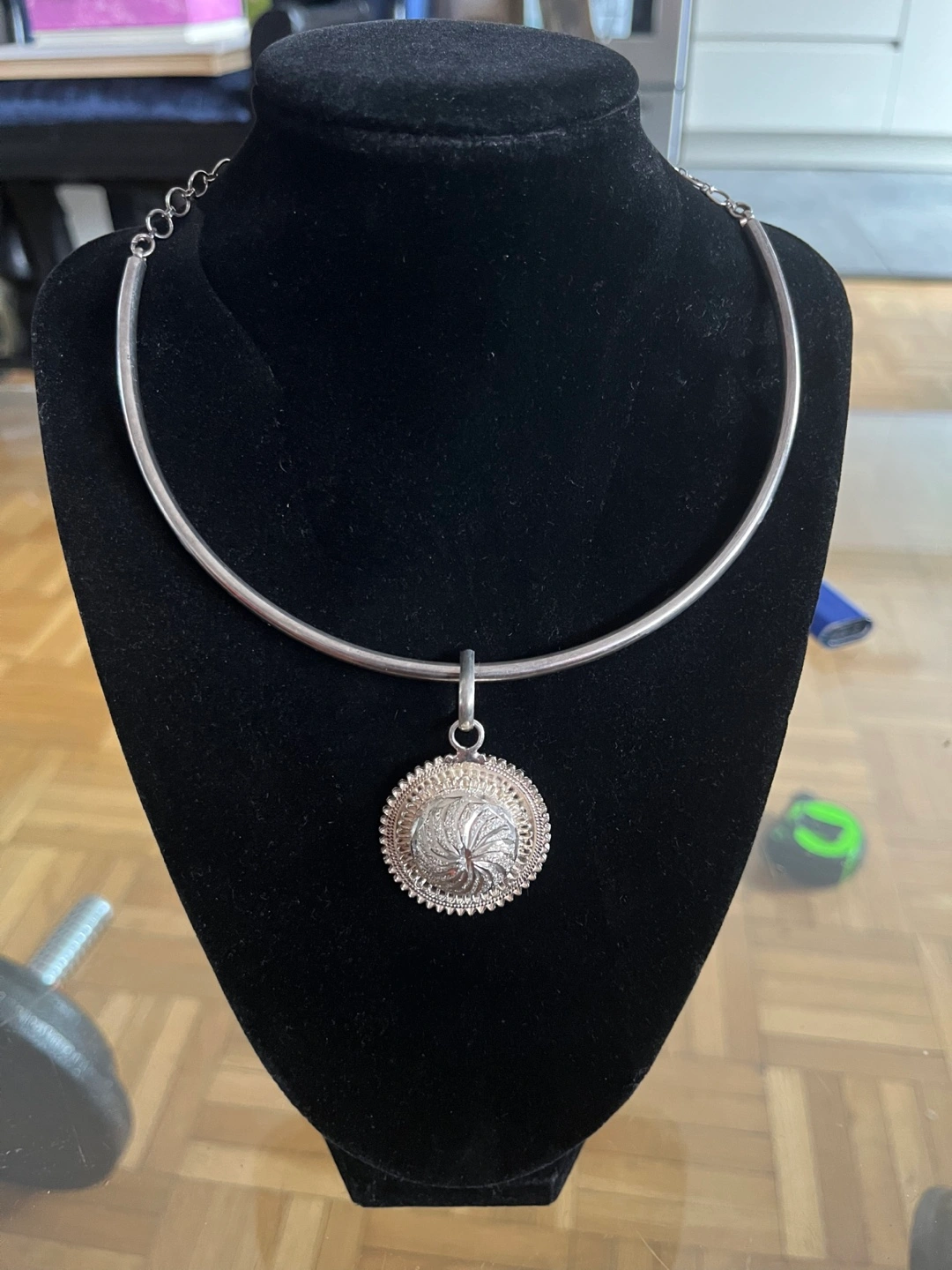 Unique, elegant sterling silver necklace. Features a large circular pendant with detailed swirling design. Pendant hangs from a simple, modern choker-style necklace. 925 sterling silver. Pendant intricately cut so that it sparkles. You can pick up by Carlton and Jarvis area Serious enquiries only please. Too many people wasting my time and low balling and not following up.