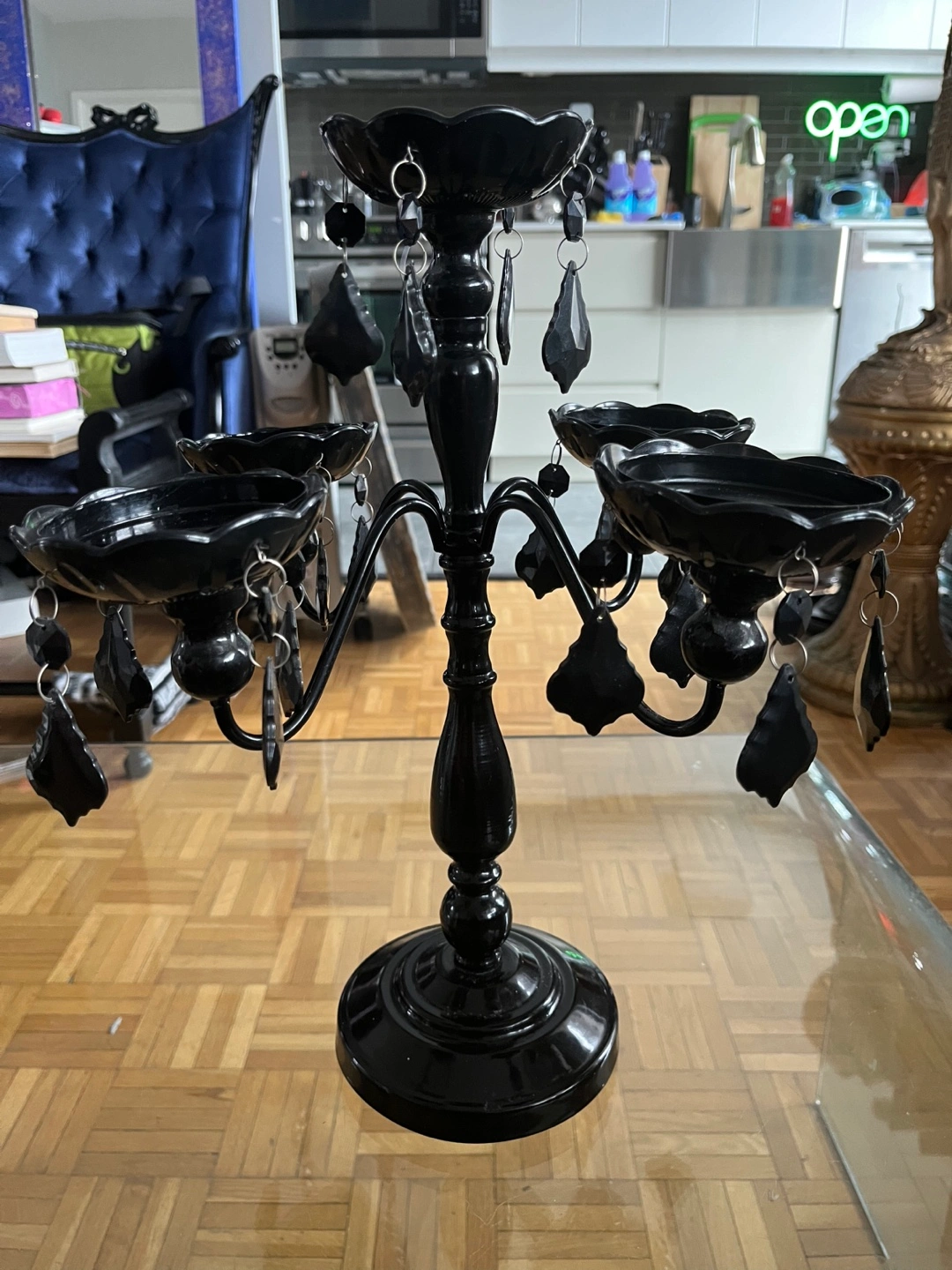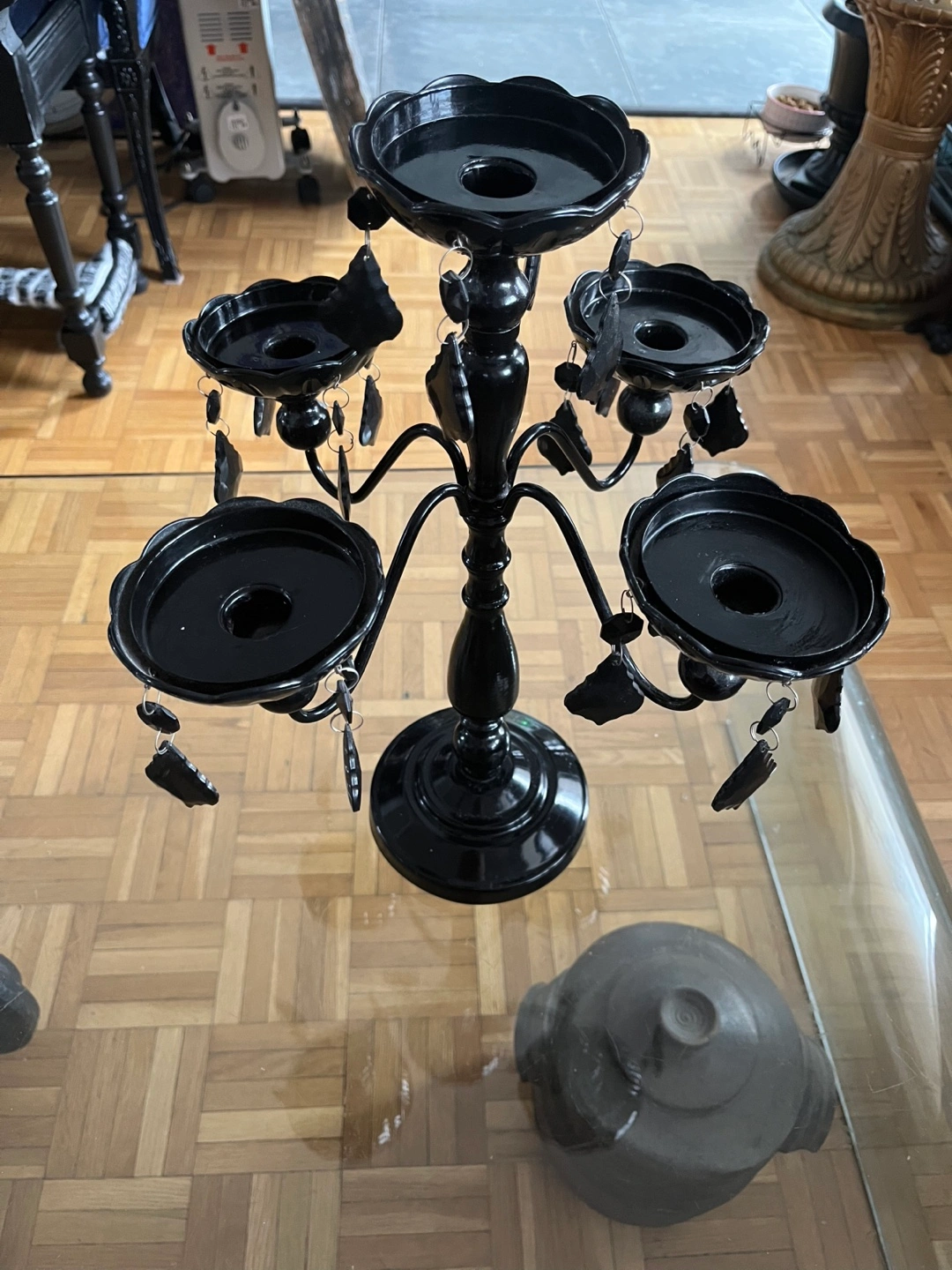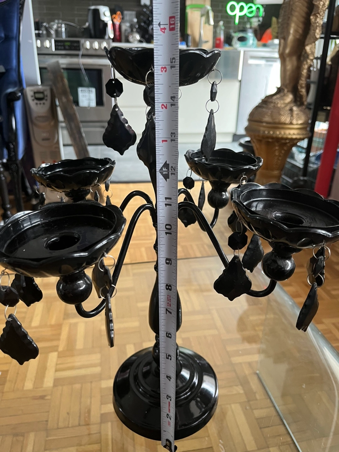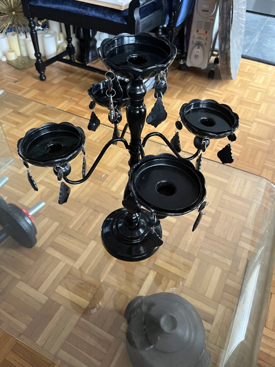 Elegant black candle holder. Five candle cups. Features dangling crystal accents. Perfect for home décor or special events. You can pick up by Carlton and Jarvis area Serious enquiries only please. Too many people wasting my time and low balling and not following up.