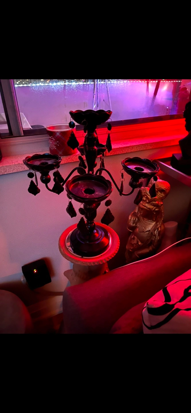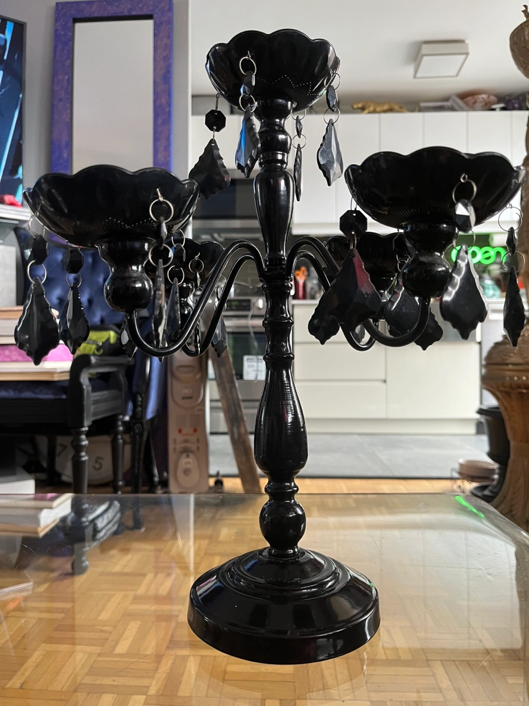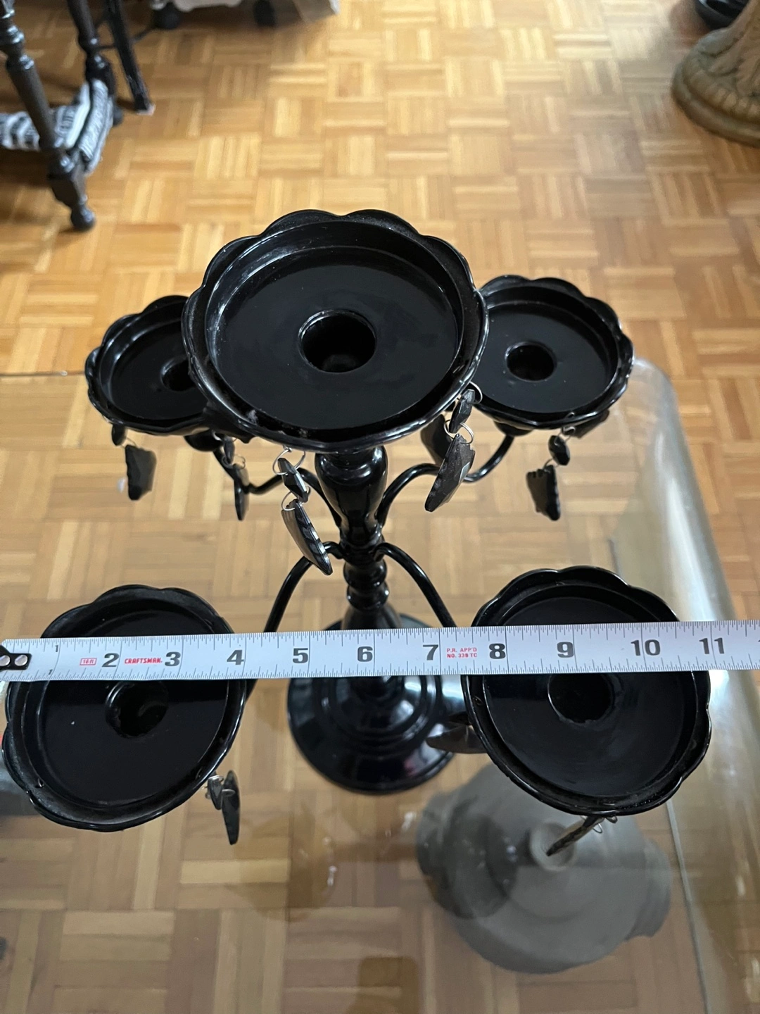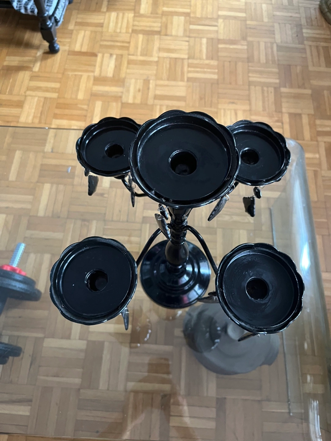 Elegant black candle holder. Five candle cups. Features dangling crystal accents. Perfect for home décor or special events. You can pick up by Carlton and Jarvis area Serious enquiries only please. Too many people wasting my time and low balling and not following up.
