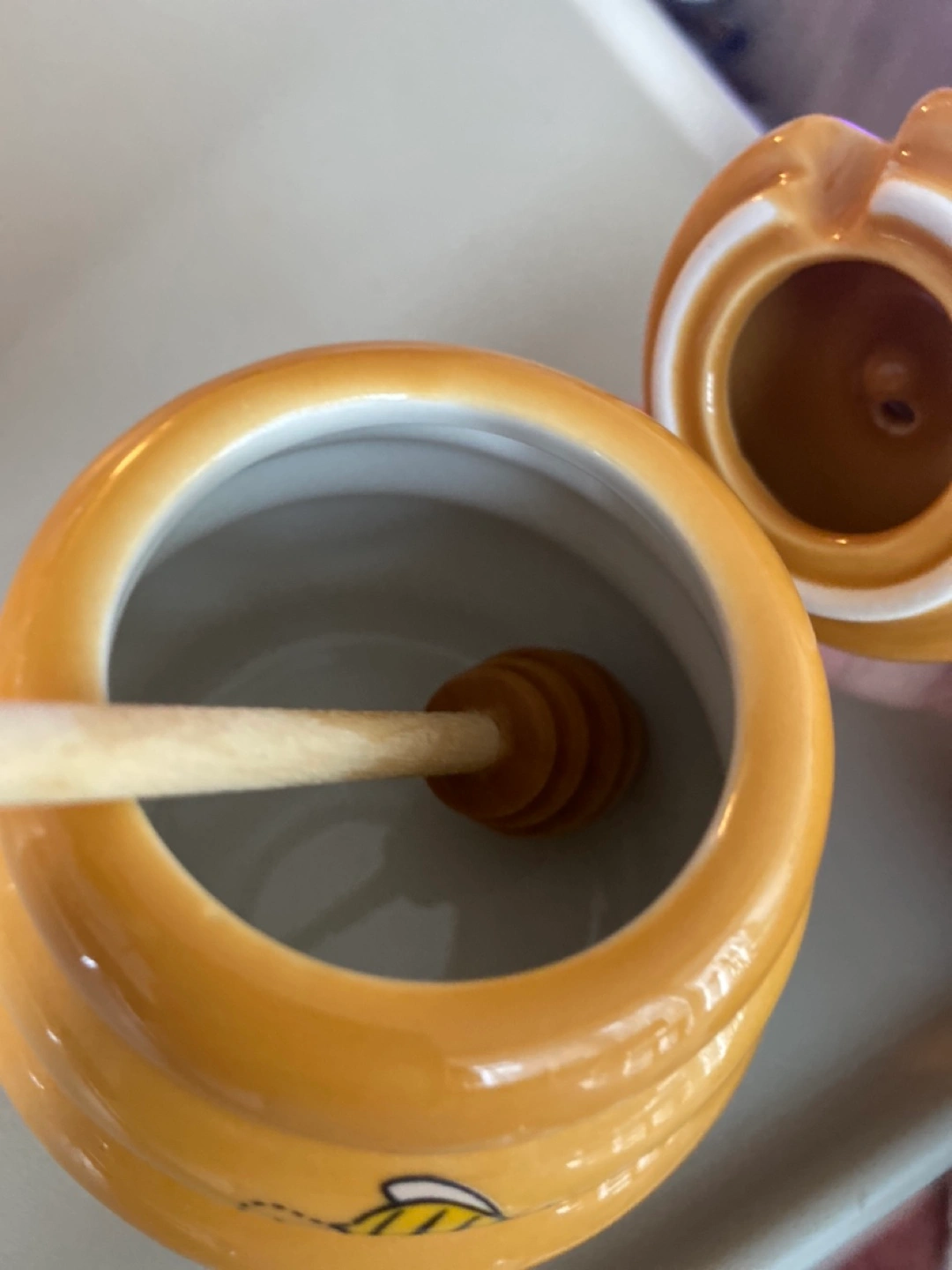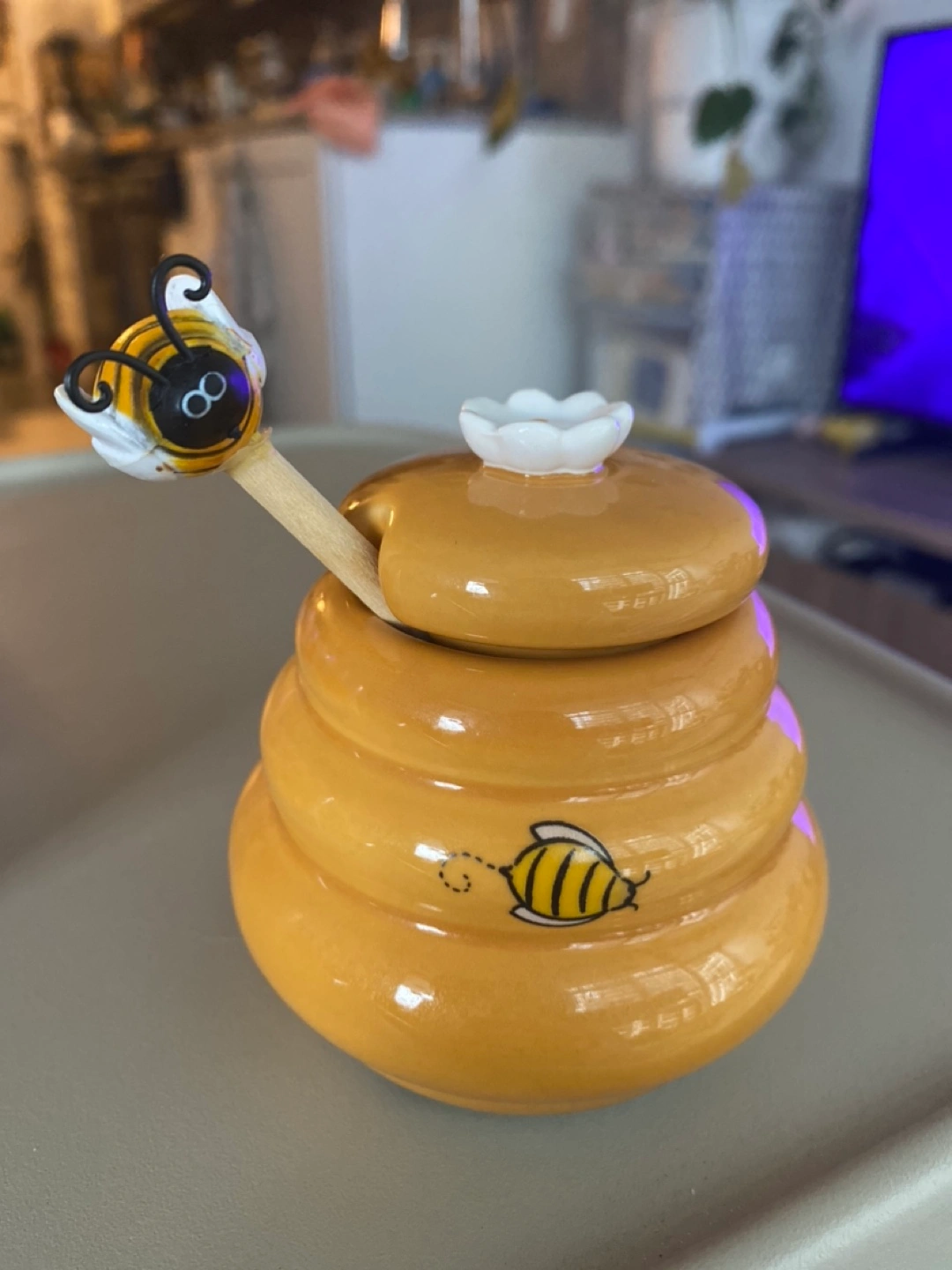Cute honey pot shaped like a beehive. Features a small bee-shaped honey dipper. Perfect for honey or other condiments. Small size, ideal for a kitchen counter or table. I can meet at Adelaide east & sherbourne or king station most of the days!