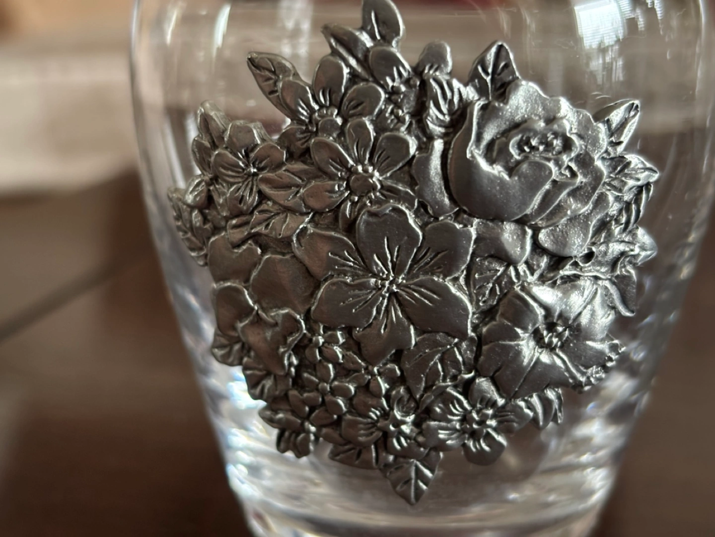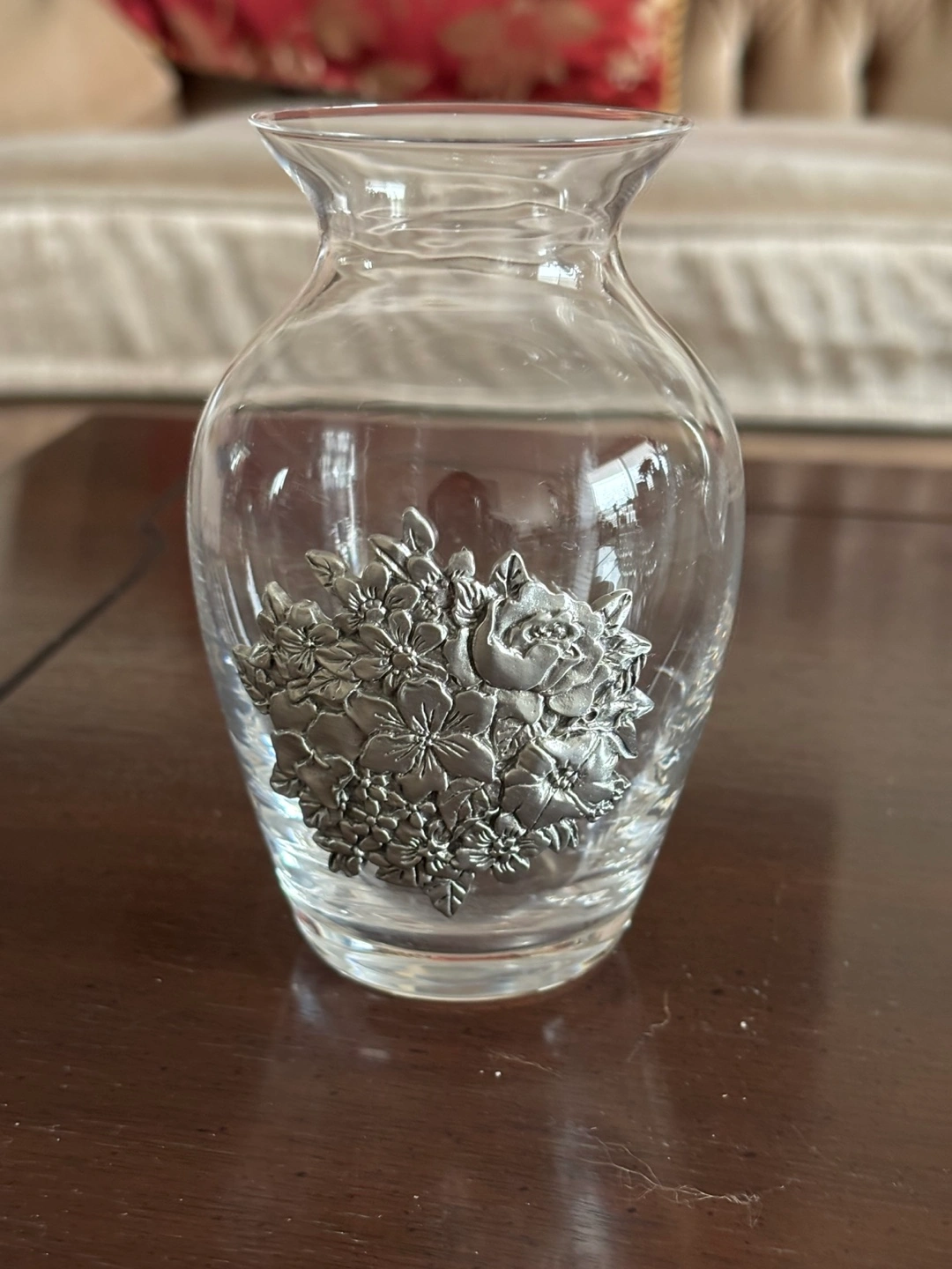 Small glass vase. Features a lovely pewter floral design. Perfect for a small bouquet or as a decorative accent. **PRISTINE CONDITION** Pick up and cash only pls