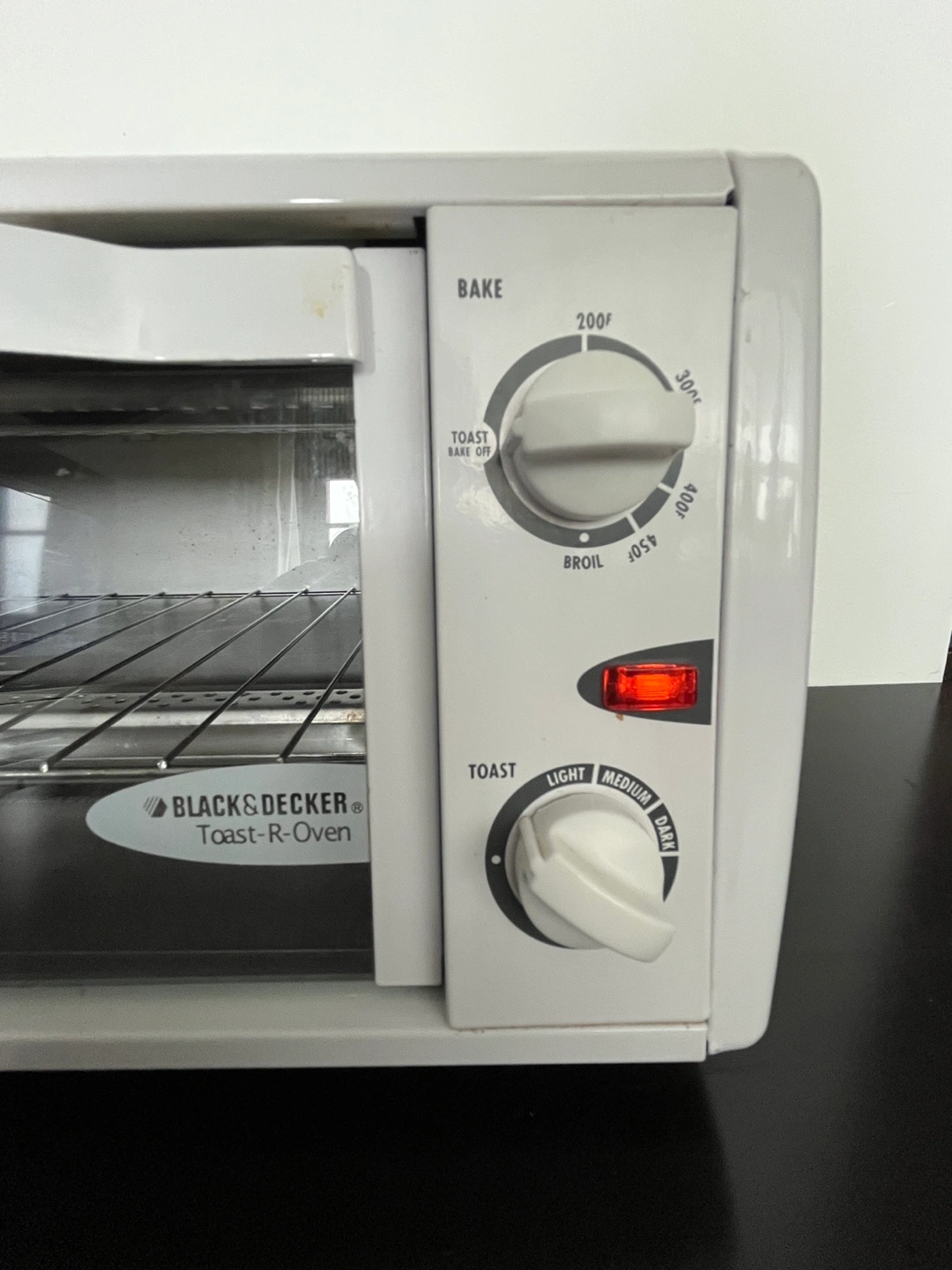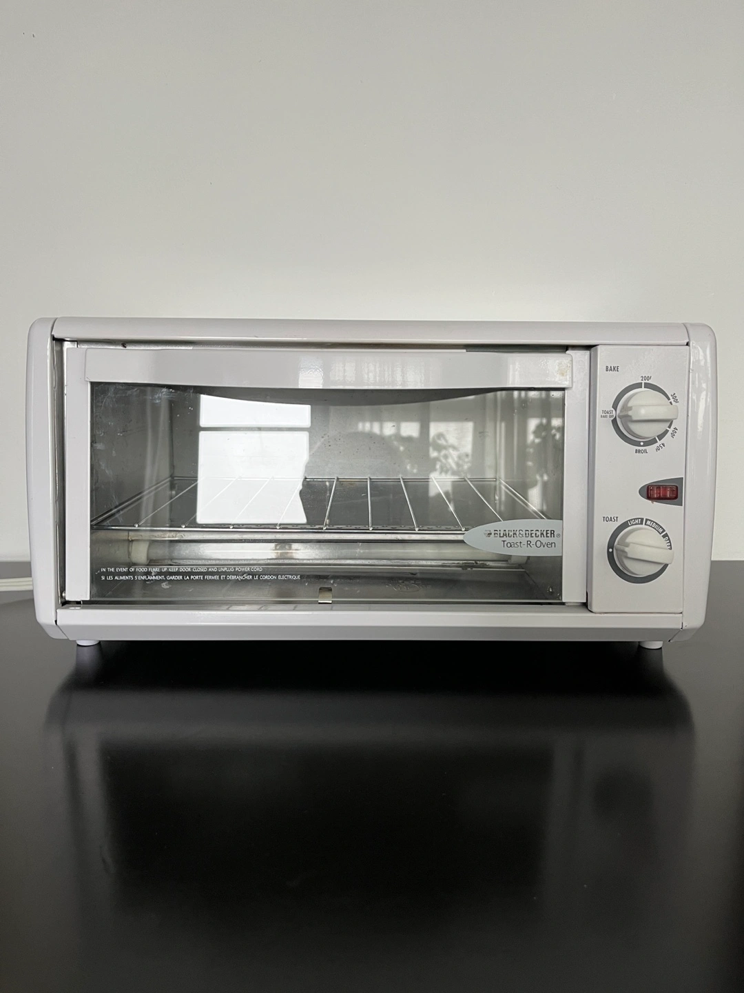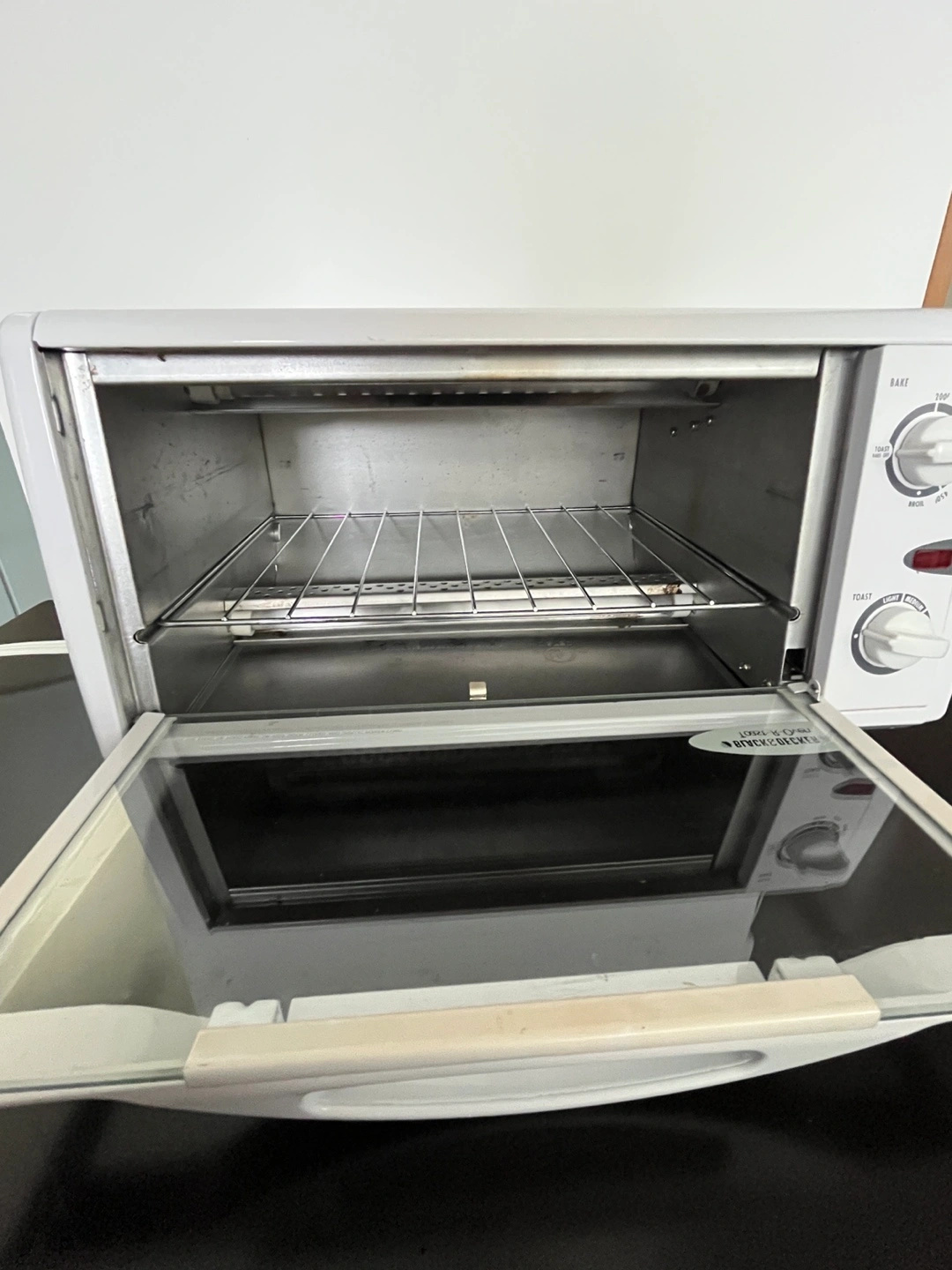White toaster oven. Features bake, toast, and broil functions. Includes rack. Good condition.