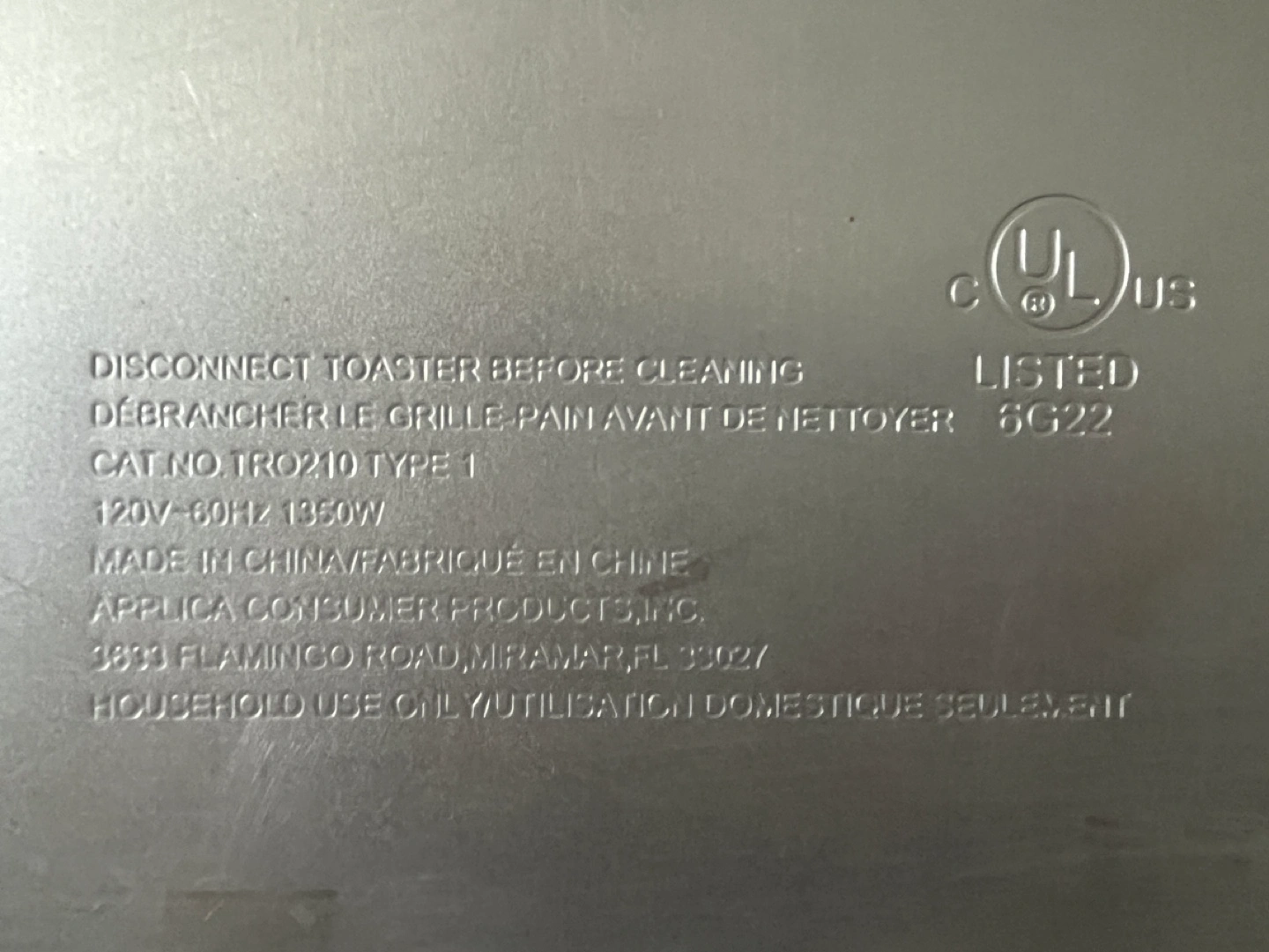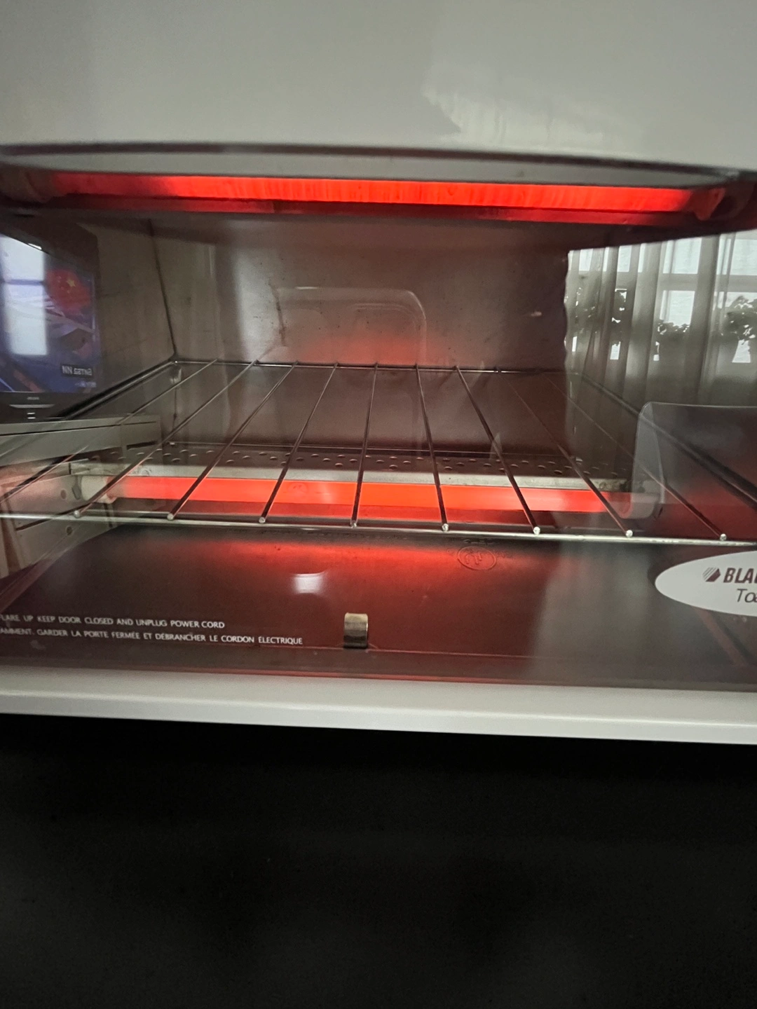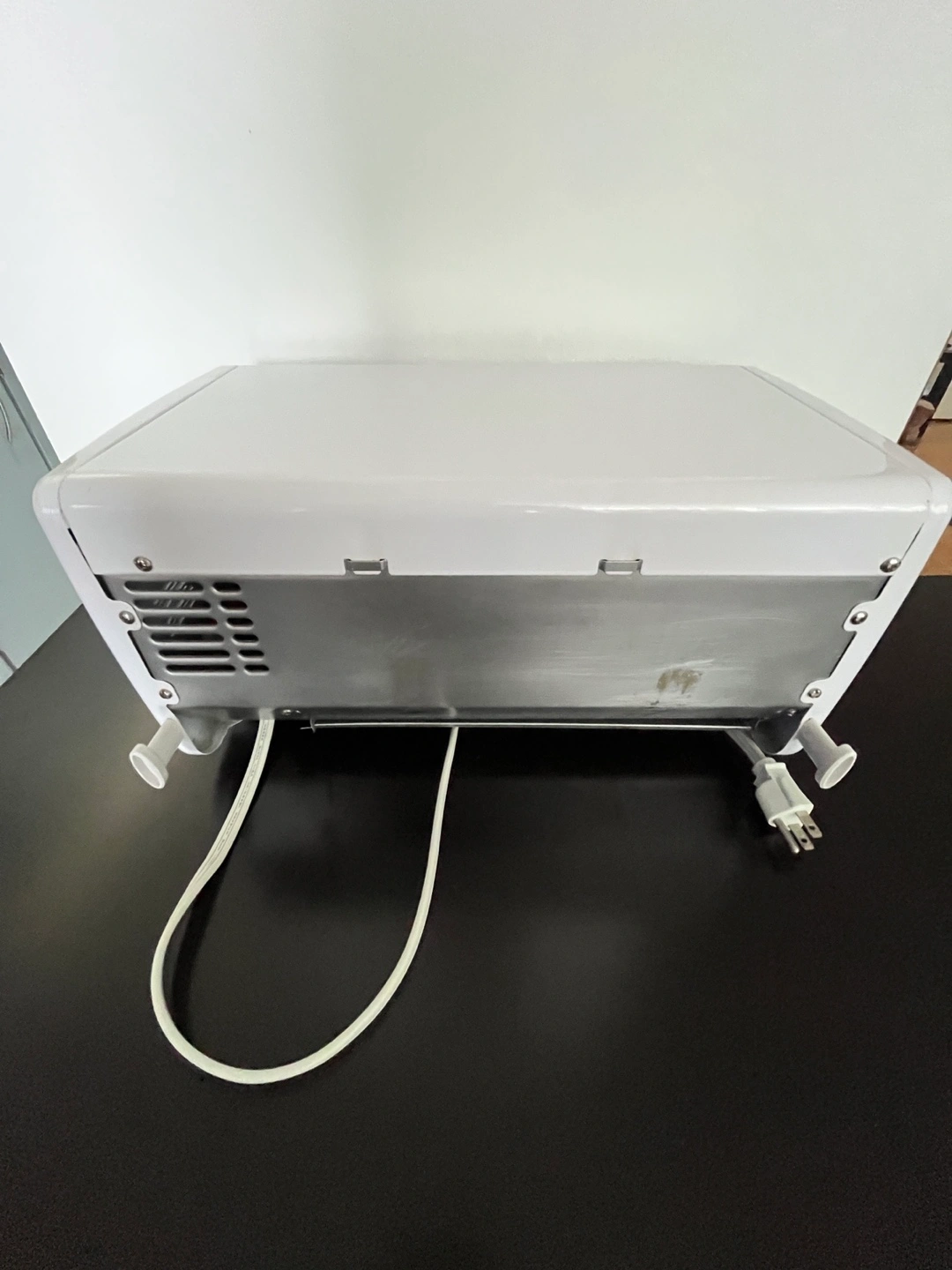 White toaster oven. Features bake, toast, and broil functions. Includes rack. Good condition.